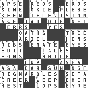 ACROSS 1. Domed church section 5. Vintage cars 9. Greek god of love 13. Trig term 14. Migrant worker of the '30s 15. Cadet 16. Peachy ____! 17. Boob tube 19. Adept person 20. Small amount or degree 21. Expire 22. Fish or hair follower 23. Blunders 25. Consenting reply 26. Profane or obscene expressions 30. Relationship diagram 34. Satellite of Uranus 35. Coop moms 36. Teases 39. Related on the mother's side 42. Snake ____ (dice throw) 43. Prepare for publication 44. Falsehoods 46. Immeasurably long periods of time 47. Grin 48. Trim (branches) 51. Toward the sea 54. White ___ sheet 57. Ewer handle 58. Player for Phoenix 60. Overdraft (abbr.) 62. Complicated, petty procedures 65. Bristle 66. Small stream 67. Shed a tear 68. Arab leader 69. Command 70. Chops off 71. Jane of fiction DOWN 1. "____ silly question..." 2. Part 3. Scornful expression 4. Car or cant ending 5. Round or rotation of duties 6. Made supply last 7. Petroleum 8. Morally degraded 9. Raised railways 10. It's straight from the horse's mouth 11. Mitch Miller's instrument 12. Transmitted 15. Sliced desserts 18. Compete 20. Russian ruler of old 24. Exposes to great heat 27. Make a knot 28. Layer 29. Narrow boards 30. College papers 31. Marina Del _, California 32. Compass dir. 33. Curvy letter 36. To riddle 37. Wedding promise 38. Storage container 40. Scottish cap 41. Connecticut Ivy Leaguer 45. Enthusiasm 48. Path through which fluid escapes 49. Boat paddle 50. Move like a hungry wolf 52. Foe 53. Having gotten out of bed 54. Bowlike part 55. Male parent of an animal 56. Eons 58. Ooze 59. United States Postal Service (abbr.) 61. Conductor's collection 63. Was introduced to 64. Lion 65. Perceive with the eye