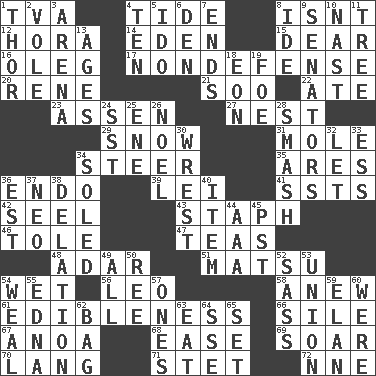 ACROSS 1. Federal power corp. 4. Event that recurs at intervals 8. Is not 12. Israeli folk dance 14. Locale of original sin 15. Letter starter 16. Cassini of fashion 17. Unrelated to defense, as in spending 20. French philosopher Descartes 21. "Barney Miller" actor Jack 22. Had dinner 23. NE Netherlands city 27. Egg locale 29. Frozen precipitation 31. Undercover agent 34. Navigate 35. Ancient Greek god of war 36. Inside; within (prefix) 39. Luau accessory 41. Fast planes 42. Sew up the eyelids of hawks and falcons 43. Staphylococcus 46. Lacquered or enameled metalware 47. Beverages made from leaves 48. The sixth month of the Jewish calendar 51. Taiwanese island in East China Sea 54. Dripping 56. Lion 58. Afresh 61. The property of being fit to eat 66. Filth; sediment 67. Small Philippine buffalo 68. Comfort 69. Fly high 70. Austrian-born American filmmaker Fritz 71. Proofreading order 72. Compass dir. DOWN 1. Son of Odin 2. Grand slam 3. Sports stadium 4. "___ Little Indians" 5. Wedding promise 6. Lair 7. Conclusions 8. Binary compound 9. Elected representatives 10. Political cartoonist Thomas 11. Family _ (genealogy) 13. Matures 18. A really long time 19. Enemy 24. Fast jet (abbr.) 25. Compass dir. 26. Christmas carol 28. Box-office sellout 30. Obtain by seizing forcibly or violently 32. Allow 33. Curvy letter 34. Having a sole or soles 36. Eastern Standard Time (abbr.) 37. Modern: prefix 38. Conveyance 40. A whole individual unit 44. American Automobile Association (abbr.) 45. Pacific Standard Time (abbr.) 49. Everything 50. To sift 52. Backtalk 53. The state of being joined or united 54. Welt 55. Pulitzer Prize-winning author Ferber 57. Washington bills 59. Enthusiasm 60. We are 62. Paper or plastic container 63. Consume 64. Compass dir. 65. Put into a specified state