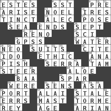 ACROSS 1. _____ Park, CO 6. Fast jet (abbr.) 9. Before (prefix) 12. Get up 13. Christmas carol 14. Angers 15. A color or tint 16. Actor Baldwin 17. Airs 18. Ocean 19. Extremities 20. Back-to-school mo. 21. Former U.S. Attorney General Janet 23. _-fi 24. Global Positioning Systems (abbr.) 25. Wetness 28. Modern: prefix 30. Costumes for special activities 34. Quote 35. Wedding promise 36. Principle of right and wrong 38. Santa ___, CA 39. Expression of disdain 41. Father Junipero _ 43. Scottish cap 44. Bull 46. _ vera 48. Sound made by sheep 49. Coast Guard woman 50. We are 51. Elected reps. 53. White ___ sheet 56. Sweet dark-red dessert wine 57. Mountain range southwest of Kyrgyzstan 58. Lacking originality or spontaneity 60. Blunders 61. Vertical spar for supporting sails 62. Singer Mel 63. Marina Del _, California 64. Mature 65. Believer in; advocate of (suffix) DOWN 1. Erode 2. Indian titles of respect 3. Prong on a fork 4. Fortification 5. Put into a specified state 6. Exchanged or delivered for money 7. Observes 8. Affectionate concern, for short 9. Appease 10. Take ten 11. Compass dir. 13. Billionth: prefix 14. Medicinal drug used to evoke vomiting 19. Follow as a consequence or result 20. Compass dir. 22. Double-curved letter 24. Sour, prickly fruit 26. Inactive volcano in Sicily 27. 480, 500 or 516 sheets of paper 28. Pinches, bites 29. Prepare for publication 31. It is 32. Definite Article 33. Title for a knight 37. Dice game 40. Centers of feelings and intuitions 42. Wing 45. Actress Charlotte 47. Speaker 49. In a ____ (agitated or irritated) 50. Had on 51. Volcanic refuse 52. Relaxation 54. Indian skirt 55. _ mater 56. For each 57. Wet nurse (var.) 58. R.R. building 59. Car or cant ending