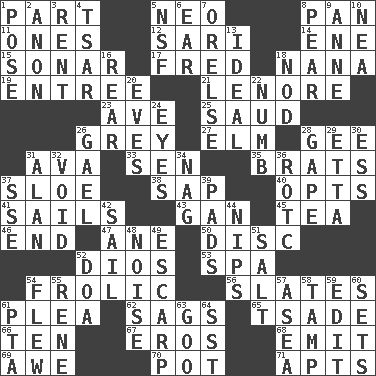 ACROSS 1. Piece 5. Modern: prefix 8. Baking dish 11. Singles 12. Indian skirt 14. Compass dir. 15. Echolocation 17. Flintstone 18. Nanny 19. Main course 21. Poe poem 23. "___ Maria" 25. Saudi Arabian king (1953-1964) 26. Jennifer or Joel 27. Shade tree 28. Turn to the right 31. Actress Gardner 33. Elected rep. 35. Naughty children 37. A type of plum 38. Plant excrement 40. Elects 41. Travels by water 43. Separate the seeds from cotton 45. Beverage made from leaves 46. Conclude 47. A saturated hydrocarbon 50. Plate 52. "Vaya con ____" 53. Health resort 54. Play 56. Chalkboards 61. Entreaty 62. Settles 65. Sadhe (variant) 66. Nine, plus one 67. Greek god of love 68. Give off 69. Deep reverence 70. Plant holder 71. Tenement units (abbr.) DOWN 1. Airs 2. At once, immediately (arch.) 3. Monthly bill 4. Russian ruler of old 5. Science/research agcy. 6. Hearing organ 7. Threatening words 8. Lightbulb-shaped fruit 9. Queen of England 1702-14 10. Teachers' org. 13. Perfect 16. Hitchcock's "____ Window" 18. Dreamland 20. Nights before holidays 22. Unfeeling 24. Snake ____ (dice throw) 26. Highlander 28. Yawn 29. Singer James 30. Curvy letter 31. Actor Alda or Thicke 32. Null 34. Tired old horse 36. College mil. group 37. Compass dir. 39. Groovy apts. 42. Move on water 44. Cuts off 48. Annoying sound 49. Fortification 51. Table seasoning 52. ___ good deed 54. Soared 55. French philosopher Descartes 57. Toward the sea 58. Pack (down) 59. Prepare for publication 60. Puts into a specified state 61. Parent Teacher Association (abbr.) 63. Thick or sticky substance 64. Fast jet (abbr.)