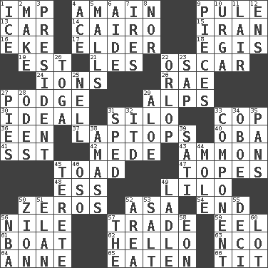 ACROSS 1. Naughty child 4. With great haste 9. Whine 13. Automobile 14. Capital of Egypt 15. SW Asia republic 16. Make supply last 17. A person who is older than you are 18. Armor plate that protects the chest 19. Eastern Standard Time (abbr.) 21. French article 22. Witty Wilde 24. Charged atoms 26. Actress Charlotte 27. Plash 29. High mountains 30. Perfect 31. Grain storage tower 33. Police officer (slang) 36. Car or cant ending 37. Portable computers 40. Chief or king in Benin or Nigeria 41. Fast jet (abbr.) 42. Ancient Persian 43. ID or VA city 45. Frog relative 47. Drinks excessively 48. Double-curved letter 49. _ and Stitch 50. Nothings 52. White ___ sheet 54. Conclude 56. The longest river in the world 57. Barter 59. Snakelike fish 61. Water vessel 62. Phone greeting 63. Non-commissioned officer (abbr.) 64. Singer Murray 65. Ingested 66. Teat (slang) DOWN 1. Frozen water 2. Create 3. Elected leader of a country 4. Adept person 5. Shopping centers 6. Assistant 7. Angers 8. And not 9. Components 10. Capital and largest city of Mongolia 11. Den 12. Followers of ems 20. Ancient Roman robe 22. Fourth or lowest deck 23. Plant excrement 25. 1994 drama film starring Jodie Foster 27. Sliced desserts 28. Lyric poems 29. _ vera 31. Moved rapidly 32. It would 33. Part 34. Mitch Miller's instrument 35. Zero-star reviews 38. Collect or gather 39. Suttee (variant) 44. Undercover agent 45. Cylindrical with tapered ends 46. Bear (Spanish) 49. Dipping utensil 50. The Jewish people; Israel 51. Liveliness 52. Type of rug 53. Table seasoning 55. Tenth: prefix 56. Basketball assoc. 57. Definite Article 58. A really long time 60. Car dealer's back yard