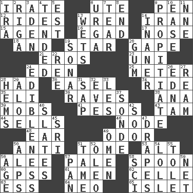 ACROSS 1. Feeling or showing extreme anger 6. Shoshoni 9. Fenced enclosure 12. Amusement-park features 13. Songbird 14. SW Asia republic 15. Representative 16. Mild oath 17. Olfactory organ 18. Added to 19. Play the lead 20. Open wide 21. Greek god of love 23. University (slang) 24. Genesis locale 25. Distance measurement 28. Possessed 30. Artist's stand 34. Travel on or in a vehicle 35. Connecticut Ivy Leaguer 36. All-night dance parties 38. Santa ___, CA 39. Disorderly crowds 41. Mexican monetary units 43. Scottish cap 44. Makes a sale 46. Thickened enlargement 48. Hearing organ 49. Scent 50. Against 51. Heavy book 53. The first octave above the treble staff 56. Toward shelter 57. Diluted with white 58. Soup utensil 60. Global Positioning Systems (abbr.) 61. So be it 62. Cell (Danish) 63. Curvy letter 64. Modern: prefix 65. Small island DOWN 1. Lyricist Gershwin 2. Port city in Latvia 3. An important port of Yemen 4. Looked after 5. Eastern Standard Time (abbr.) 6. Capital and largest city of Mongolia 7. Pull apart 8. Conclude 9. Conciliate 10. Comfort 11. Compass dir. 13. Moistens 14. Sillier 19. Echolocation 20. Chewing product 22. To separate or throw off 24. The property of being fit to eat 26. Pulitzer Prize-winning author Ferber 27. 480, 500 or 516 sheets of paper 28. Is hesitant and indecisive 29. Medicinal plant 31. Plant excrement 32. First lady 33. French article 37. Message 40. Chalkboards 42. "Barney Miller" actor Jack 45. Indian title of respect (Mr.) 47. Window treatments 49. Sign of things to come 50. High mountains 51. Docile 52. Margarine 54. Hang loosely or laxly 55. Lacquered or enameled metalware 56. Grow older 57. Baking dish 58. _-fi 59. Remaining after all deductions