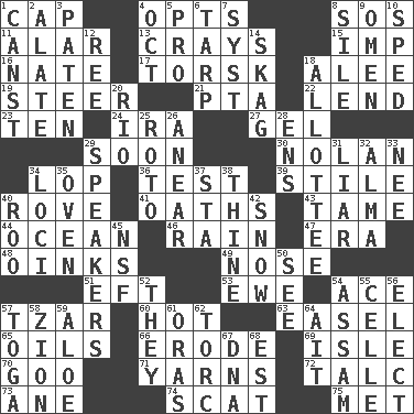 ACROSS 1. Head covering 4. Elects 8. Distress signal 11. Having or resembling wings 13. Trading vessels 15. Mischievous child 16. Nathan's nickname 17. Cod relative 18. Toward shelter 19. Bull 21. Parent Teacher Assoc. 22. Grant temporary use of 23. "___ Little Indians" 24. Lyricist Gershwin 27. Set 29. Within a short period 30. Pitcher Ryan 34. Trim (branches) 36. Trial 39. Vertical member of a panel or frame 40. Be footloose 41. Profane or obscene expressions 43. Docile 44. Sea 46. Water falling in drops from the sky 47. Epoch 48. Pig sounds 49. Sense of smell 51. Lizard (obsolete) 53. She-sheep 54. Adept person 57. Russian ruler 60. Being at a high temperature 63. Artist's stand 65. Petroleums 66. Wear away 69. Capri or Wight 70. Thick or sticky substance 71. Entertaining tales 72. Baby powder 73. One (Scot) 74. Get outta here! 75. Was introduced to DOWN 1. 2nd pers. sing. pres. of can (arch.) 2. Having winglike extensions 3. Eucharist need 4. Sep. follower 5. Adept person 6. Canvas cover 7. System (abbr.) 8. Filth; sediment 9. Sign of something about to happen 10. Broke a traffic law 12. To sift 14. Heroin 18. One to whom something is allotted 20. River (Sp.) 25. Printing process, for short 26. Approach 28. Followers of ems 29. Orators 31. One who doesn't tell the truth 32. _ mater 33. Born 34. Locales 35. Baking chamber 37. R.R. building 38. One or ones belonging to thee 40. Friend of Pooh 42. Overwhelm 45. Science/research agcy. 50. Perceive with the eye 52. Those things 54. Indian state 55. Cell (Danish) 56. Choose 57. Ancient Roman robe 58. The Jewish people; Israel 59. Medicinal plant 61. Mouths or openings 62. Torque (variant) 64. Small island 67. Heredity factor (abbr.) 68. Eastern Standard Time (abbr.)