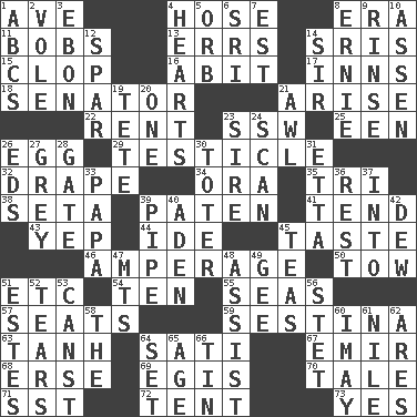 ACROSS 1. "___ Maria" 4. Stockings 8. Period 11. Moves up and down 13. Blunders 14. Indian titles of respect 15. Hoof sound 16. "This won't hurt ____!" 17. Taverns 18. Elected representative 21. Originate 22. Monthly bill 23. Compass dir. 25. Car or cant ending 26. Oval reproductive body of a fowl 29. One of the two male reproductive glands 32. Window treatment 34. Mouth or opening 35. Three (prefix) 38. Stalk of a moss capsule 39. Eucharist need 41. Watch over 43. Slangy assent 44. Binary compound 45. Clothes sense 46. Electrical Measurement 50. Pull behind 51. And so on (abbr.) 54. "___ Little Indians" 55. Oceans 57. Theater features 59. French poetic form 63. Hyperbolic tangent 64. Suttee (variant) 67. Arab leader 68. Celtic language 69. The front part of a cuirass 70. Lie 71. Fast jet (abbr.) 72. Portable shelter 73. Affirmative reply DOWN 1. Lettered men learn these first 2. Grand slam 3. Inky black, to poets 4. Centers of feelings and intuitions 5. Globe 6. Indian title of respect (Mr.) 7. Eastern Standard Time (abbr.) 8. Bert's buddy 9. Wash lightly 10. NE Netherlands city 12. Coast Guard woman 14. Title for a knight 19. Wig 20. Single 21. Leather borer 23. Father 24. Examine minutely or intensely 26. Begley and Asner 27. Jennifer or Joel 28. Yard entry 30. Carrier 31. Singer James 33. Dad 36. Relief 37. To the inside or interior of 39. Corncob 40. Arabian gulf 42. Morning condensation 45. Beverages made from leaves 47. Mountains (abbr.) 48. Help 49. Turn to the right 51. _____ Park, CO 52. Lacerates 53. 2nd pers. sing. pres. of can (arch.) 56. Proofreading order 58. Definite Article 60. "If ____ say so..." 61. Mediterranean tributary 62. Ancient Greek god of war 64. Arrange properly for use 65. Mature 66. Shallow baking pan