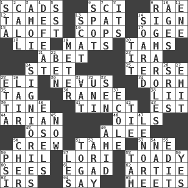 ACROSS 1. Loads 6. _-fi 9. Actress Charlotte 12. Makes less strong or intense 13. Petty quarrel 14. Attach a signature 15. At or to great height 16. 911 reaches them 17. Double curve, resembling the letter S 18. Untruth 19. Floor coverings 20. Scottish caps 21. Collude with 23. Retirement account (abbr.) 24. Proofreading order 25. Laconic 28. Connecticut Ivy Leaguer 30. Mole, birthmark 34. Dormintory (informal) 35. Label 36. Indian princess (variant) 38. Cards in a Roman deck? 39. Prong on a fork 41. Tinged 43. Eastern Standard Time (abbr.) 44. Believer in; advocate of (suffix) 46. Petroleums 48. Bear (Spanish) 49. Toward shelter 50. Group working together 51. Docile 53. Compass dir. 56. Silvers or Donahue 57. Australian parrot (variant) 58. Sycophant 60. Observes 61. Mild oath 62. Nick name for Arthur 63. Big collection agency 64. Declare 65. Confronts DOWN 1. R.R. building 2. Give a ring to 3. Mine, in Marseilles 4. Outscore 5. Fast jet (abbr.) 6. Specific locale 7. Balmoral and tarboosh 8. It is 9. Frustrating wastes of time 10. Eras 11. Compass dir. 13. Go away! 14. Flew 19. Distance measurement 20. Teat (slang) 22. Benjamin's nick name 24. Seigniories (variant) 26. Indian titles of respect 27. Send forth 28. Singer James 29. Den 31. Large container 32. Single; one (prefix) 33. Elected rep. 37. Learning spot: Fr. 40. Artist's stands 42. Neckwear 45. At this time 47. Poe poem 49. Among 50. "Mermaids" star 51. Ancient Roman robe 52. Like ___ of sunshine 54. Nathan's nickname 55. Prepare for publication 56. Air pressure measure (abbr.) 57. French article 58. Scottish cap 59. It is so