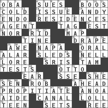 ACROSS 1. Chief or king in Benin or Nigeria 4. Takes to court 8. Expressions of contempt or scorn 12. Chilled 14. Come out of 16. Actor Griffith 17. Inside; within (prefix) 18. Homes 20. Rep 22. Label 23. Eastern Standard Time (abbr.) 24. Not either 25. To free from 28. Atlas unit 30. Prong on a fork 31. Window treatment 35. Deep reverence 37. California wine valley 40. Taken by mouth 41. Having or resembling wings 42. Bobsleighs 44. 1994 drama film starring Jodie Foster 45. Old wives' tales, e.g. 46. Indian titles of respect 47. Scottish cap 48. Trials 50. Von Bismarck 52. Hearing organ 54. Compass dir. 55. A female animal or person 58. Elected rep. 61. Director Reiner 63. Having the leading position 65. Conciliate 70. Small Philippine buffalo 71. Assistant 72. Lessep's creation 73. Hang loosely or laxly 74. Adolescent 75. Puts into a specified state 76. To separate or throw off DOWN 1. Sea 2. Beat drum 3. Tree or shrub in the Birch family 4. Title for a knight 5. Purpose 6. Curvy letter 7. Costume for a special activity 8. Bar 9. At one time in the past 10. Lyric poems 11. System (abbr.) 13. Spanish title 15. Dutch treat 19. Mild oath 21. Three (prefix) 26. Lodging establishments 27. Allots cards 29. Right away 30. Cylindrical with tapered ends 32. Length times width 33. Inside of hand 34. Pipe bend 35. Medicinal plant 36. Armed conflicts 38. For each 39. Goodbye (Sp.) 41. The first octave above the treble staff 43. Fast planes 49. Indian skirt 51. Beverage made from leaves 53. College mil. group 55. Sir (Sp.) 56. White Person, in Hawaii 57. Peak District village in England 58. Argument over a trivial matter 59. One of the Great Lakes 60. Connecting point 62. Prejudice 64. Actor Linden 66. Fenced enclosure 67. A saturated hydrocarbon 68. Make lace 69. Raised railways