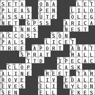 ACROSS 1. Bristle 5. Chief or king in Benin or Nigeria 8. Allow 11. Entreaties 13. Animal enclosure 14. _ and Stitch 15. Slender Brazilian palm 16. Shoshoni 17. Cassini of fashion 18. Remaining after all deductions 19. Global Positioning Systems (abbr.) 21. N. Chile seaport 22. Lodging establishments 24. Egg locale 25. Buttonhole 27. Boy, to dad 29. Friends 30. It is permitted: Lat. 32. Family _ (genealogy) 33. To the left, to Queeg 35. Blind as ____ 39. Small fatty European fish 41. Promenade 42. It would 43. Medicinal drug used to evoke vomiting 45. Hoof sound 48. Keg 49. Place in a line 50. Rendezvous 52. Scottish cap 55. Be footloose 56. 54 in ancient Rome 57. Peak District village in England 59. Nights before holidays 60. Connecticut Ivy Leaguer 61. High-strength synthetic material 62. Elected rep. 63. Pipe bend 64. Supplements with great effort DOWN 1. Connect, as a bridge 2. Otherwise 3. A testis 4. Auto club (abbr.) 5. Musical composition 6. Stakes 7. One (Scot) 8. Ms. Damita and namesakes 9. Opt 10. Ancient Roman robe 12. Omens 14. Old wives' tales, e.g. 20. Pacific Standard Time (abbr.) 21. Singer Murray 23. Olfactory organs 25. Fitting 26. Auto 27. Title for a knight 28. Sep. follower 30. Car dealer's back yard 31. Softens 33. Tate display 34. Groovy apt. 36. Sass 37. In the manner of 38. Affectionate concern, for short 40. Corncob 43. Frozen water 44. Eucharist need 45. Garlic unit 46. Make or become more lively 47. Singles 49. Ancient Greek god of war 50. Place where flour is made 51. Tending to cause great harm 53. Medicinal plant 54. Not women's 56. Area sheltered from the wind 58. Color
