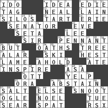 ACROSS 1. Wedding promise 4. The main thing one is thinking about 8. Singer Brickell 12. Label 13. Anneal 14. (Had) reclined 15. Grain storage towers 18. Small pie 19. One of the Great Lakes 20. Elected representative 22. Night before a holiday 23. Bristle 24. Area sheltered from the wind 25. Title for a knight 26. Pre-World Series prize 30. Yet 33. Expletives 36. Relationship diagram 37. Having or resembling wings 39. What Jean-Claude Killy likes to do 40. Behest 41. Unable to walk 42. Hold, grip (Informal) 44. Had dinner 45. Stimulate to action 47. White ___ sheet 50. Baseball player Mel 51. Sharp bark 53. Mouth or opening 54. Choose not to consume 57. Table seasoning 59. Otherwise 61. Snob 63. Stare at amorously 64. Christmas carol 65. Third day of the wk. 66. Dry up 67. Petty quarrel 68. Acura sports coupe DOWN 1. ___ a Wonderful Life 2. Raised platform 3. Stares 4. To the inside or interior of 5. Letter starter 6. Hearing organ 7. Keyboard modifier key 8. Veterans Day date 9. Have the gumption 10. One more than two 11. Compass dir. 16. Singles 17. Suttee (variant) 21. Pacific island yam 22. Car or cant ending 24. French article 26. Silvers or Donahue 27. Type of rug 28. Egg locale 29. Wig 30. Indonesian resort city 31. Uhlan (variant) 32. Scottish caps 34. American tennis player Robert 35. Ring climax 38. News announcer 42. Nonscientific branch of learning 43. 24-hour periods 46. Call ___ day 48. Arranges properly for use 49. Actor Alda or Thicke 52. Peter (Polish) 53. Rounded earthenware pot or jar 54. Toward the sea 55. Waist strap 56. Horse sense 57. Mayday 58. Mature 59. Followers of ems 60. Trim (branches) 62. John Ritter's dad