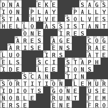 ACROSS 1. Heredity factor (abbr.) 4. Supplement with great effort 7. Sinks 11. Electrically charged atom 12. Romp 13. Friendly 14. R.R. building 15. Hub of activity 16. Finds the solution 17. Phone greeting 19. Aide 21. Single 23. Angers 24. Ancient Greek god of war 25. Personal question 26. Gear tooth 29. Ascend 30. Followers of ems 31. Actress Charlotte 32. Nilotic language 33. Big collection agency 34. Had dinner 35. Raised railways 36. _-fi 37. Staphylococcus 40. Binary compound 41. Area sheltered from the wind 42. Charged atoms 43. Glance over 45. Metal container 46. Casting lots 51. Arboreal primate 55. Foolish or stupid persons 56. Went 58. Purpose 59. Having high moral qualities 60. The smallest animal of a litter 61. Opposite of masc. 62. Celtic language 63. Compass dir. 64. Away DOWN 1. Food container 2. Short letter 3. Of or related to the anus 4. Biblical high priest 5. Polynesian shrub of the pepper family 6. Sight organs 7. Table seasonings 8. Inventor's middle name 9. Small, secluded valley 10. System (abbr.) 12. Gives a jingle 13. Airs 16. Founders of families 18. Australian parrot (variant) 20. Signals 22. Compass dir. 24. Came up 25. Nest on high 26. Dice game 27. Pledge 28. Turn to the right 29. Old (Scot.) 32. Luau accessory 33. Ancient Celtic tribe of eastern Britain 36. Narrow boards 37. Be seated 38. Bathroom 39. Singer Murray 43. Fur scarf 44. Quote 46. Trig term 47. Aroma 48. Chest bones 49. Legendary monster 50. Part of speech 52. Bungle 53. One who makes use of a thing 54. San ____ (Riviera town) 57. Compass dir.