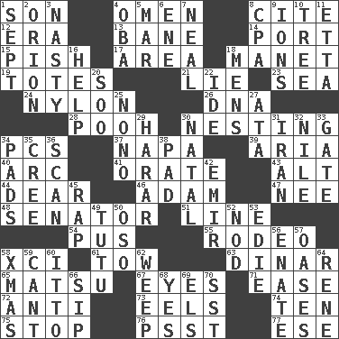 ACROSS 1. Boy, to dad 4. Presage 8. Quote 12. Period 13. Object of repulsion 14. Left side of a ship or aircraft 15. Expression of disdain 17. Type of rug 18. French painter Edouard 19. Lugs 21. Falsehood 23. Ocean 24. High-strength synthetic material 26. Heredity factor (abbr.) 28. "Silly old bear" 30. Inhabiting a nest 34. Personal Computers (abbr.) 37. California wine valley 39. Roberta Peters solo 40. Curve 41. Declaim 43. The first octave above the treble staff 44. Letter starter 46. First of billions? 47. Born 48. Legislator 51. Actor's bit 54. Product of festering 55. Cowboy competition 58. One more than ninety 61. Pull behind 63. Middle Eastern gold or silver currency 65. Taiwanese island in East China Sea 67. Snake ____ (dice throw) 71. Relaxation 72. Opposed to 73. Snakelike fish 74. "___ Little Indians" 75. Halt 76. Inconspicuous attention getter 77. Compass dir. DOWN 1. Back-to-school mo. 2. Greek mythologigal hunter 3. Characterized by obscenity 4. Chief or king in Benin or Nigeria 5. Spoil 6. Compass dir. 7. Actress Patricia 8. Tax preparer (abbr.) 9. Charged particles 10. Woody plant 11. Singer James 16. Aid 18. Not women's 20. "Barney Miller" actor Jack 22. Binary compound 25. Words to Nanette 27. "One Day ___ Time" 29. Ethiopian city, capital of Harari 30. Brizilian seaport 31. SW Asia republic 32. Mediterranean tributary 33. Yard entry 34. Writing tablets 35. Algonquian 36. Skim 38. Groovy apt. 42. Arab leader 45. Reproach for some lapse or misdeed 49. Ballerina skirt 50. Bear (Spanish) 52. Lower and raise head in agreement 53. Singer Brickell 56. Maternal 57. Fertile tracts in a desert 58. Dec. holiday 59. Patter 60. "Tell ____ the Marines!" 62. Shed a tear 64. French philosopher Descartes 66. Small drink 68. Consenting reply 69. Raised railways 70. Fast jet (abbr.)