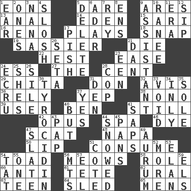 ACROSS 1. Immeasurably long periods of time 5. Have the gumption 9. Ancient Greek god of war 13. Of or related to the anus 14. Locale of original sin 15. Indian skirt 16. Former U.S. Attorney General Janet 17. Live dramatic performances 18. Fastener 19. More disrespectful 21. Expire 22. Command 23. Comfort 24. Double-curved letter 27. Definite Article 28. Penny 29. Riviera of "Kiss of the Spider Woman" 31. Spanish title 32. Opinion 36. Trust 37. Slangy assent 38. Words to Nanette 39. One who makes use of a thing 40. Benjamin's nick name 41. Free of sound 42. Musical composition 44. Health resort 46. Color 47. Scram, to a cat 48. California wine valley 50. Mouth edge 51. Ingest 54. Frog relative 56. Catcalls? 58. Hero or heavy, e.g. 60. Opposed to 61. Wig 62. Mountain range 63. Adolescent 64. Downhill vehicle 65. Not women's DOWN 1. Ewer handle 2. Singles 3. Nanny 4. Make a splashing sound 5. Erase 6. The sixth month of the Jewish calendar 7. Marina Del _, California 8. Followers of ems 9. Aide 10. Indian princess (variant) 11. Epoch 12. Small drink 17. Expression of disdain 20. Stalk of a moss capsule 21. One of the 12 tribes of Israel 23. Car or cant ending 24. Shade of tan 25. "______ My Girl" (Turtles hit) 26. Filth; sediment 28. Police officer (slang) 30. Polypeptide antibiotic 31. Lair 33. Empty area or space 34. Inwardly 35. Not divided or shared with others 37. It is so 40. On the contrary 41. Plant excrements 43. Infant food 44. Overwhelmed 45. Baking dishes 47. Schedule 49. Gold (Symbol: Au) 51. ____ d'Azur (French Riviera) 52. Greater amount 53. Style 54. Make lace 55. Single 56. Mountains (abbr.) 57. Snakelike fish 59. Raised railways