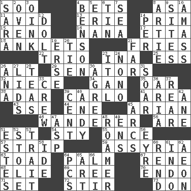 ACROSS 1. "Barney Miller" actor Jack 4. Wagers 8. White ___ sheet 11. Enthusiastic 13. 4th largest of the Great Lakes 14. Demure 15. Western Nevada city 16. Grandmother 17. Singer James 18. Short socks 21. Strips of potato fried in deep fat 22. Musical group of three 23. _ tizzy (2 wds.) 25. Double-curved letter 26. Keyboard modifier key 29. Elected representatives 32. Sibling's daughter 34. Separate the seeds from cotton 35. Rowing implement 38. The sixth month of the Jewish calendar 39. Monte _, Las Vegas Hotel/Casino 41. Length times width 43. Compass dir. 44. Compass dir. 45. Believer in; advocate of (suffix) 46. Roamer 50. "We ___ not amused" (Victoria) 51. Eastern Standard Time (abbr.) 54. Filthy place 55. Single time 57. Long narrow piece of something 59. Nineveh was its capital 63. Frog relative 64. Inside of hand 67. French philosopher Descartes 68. Writer Wiesel 69. Algonquian 70. Inside; within (prefix) 71. Put into a specified state 72. Agitate 73. Spanish title DOWN 1. "Two Mules for Sister ____" 2. Baking chamber 3. Pig sound 4. Gillaume's butler role 5. Epoch 6. Metal container 7. Ocean 8. Nick name for Arthur 9. Settings 10. Collect or gather 12. Dunce 14. For each 19. Celtic language 20. Neckwear 21. Distant 23. Slanted text style (abbr.) 24. Words to Nanette 26. Santa ___, CA 27. Flaplike coverings 28. Afternoon social gatherings 30. Match 31. Fly high 33. Group working together 36. Roberta Peters solo 37. Tail end 39. Penny 40. Actor Griffith 42. A saturated hydrocarbon 45. Curves 47. Viper 48. Wanderer 49. Followers of ems 51. _____ Park, CO 52. Fur scarf 53. Distinguishing feature 56. Jane of fiction 58. Binary compound 60. Tear apart 61. _ china 62. A really long time 64. Personal Computers (abbr.) 65. Tate display 66. Flowery wreath