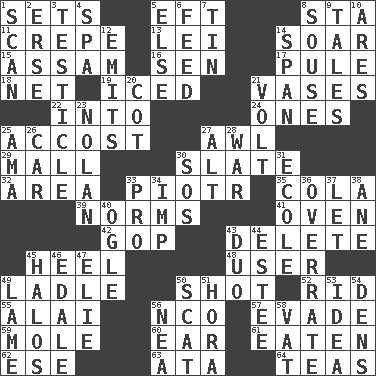 ACROSS 1. Puts into a specified state 5. Lizard (obsolete) 8. R.R. building 11. Streamer paper 13. Luau accessory 14. Fly high 15. Indian state 16. Elected rep. 17. Whine 18. Fish or hair follower 19. On the rocks 21. Flower holders 22. To the inside or interior of 24. Singles 25. Buttonhole 27. Leather borer 29. Shopping center 30. Chalkboard 32. Length times width 33. Peter (Polish) 35. Root beer relative 39. Typical models 41. Baking chamber 42. Republican Party 43. Keyboard key 45. Person who is morally reprehensible 48. One who makes use of a thing 49. Dipping utensil 50. Opportunity 52. To free from 55. Mountain range southwest of Kyrgyzstan 56. Non-commissioned officer (abbr.) 57. Elude 59. Undercover agent 60. Hearing organ 61. Consumed 62. Compass dir. 63. "One Day ___ Time" 64. Afternoon social gatherings DOWN 1. Skim 2. Celtic language 3. One of the two male reproductive glands 4. Health resort 5. Otherwise 6. Nourish 7. Metal container 8. Lush 9. Lies 10. Ancient Greek god of war 12. Sends forth 14. Connect, as a bridge 20. Small bed 21. Electrical Unit 23. Pitcher Ryan 25. Nursemaid (var.) 26. 4-wheeled motor vehicle 27. The first octave above the treble staff 28. Armed conflict 30. Mayday 31. Learning spot: Fr. 33. Adept person 34. Naughty child 36. Make much ado about nothing 37. Allow 38. One (Scot) 40. Stare at amorously 43. Superhero pair 44. First name in cosmetics 45. Rings 46. Peak District village in England 47. Writer Wiesel 49. Unable to walk 50. Get outta here! 51. Israeli folk dance 53. The main thing one is thinking about 54. Cub Scout units 56. Teachers' org. 58. Large container