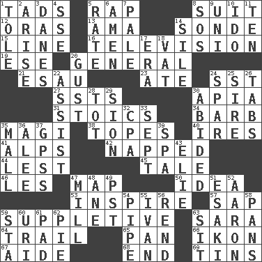 ACROSS 1. Bits 5. Hit sharply and swiftly 8. Set or collection 12. Mouths or openings 13. Wet nurse (var.) 14. Something which is sent 15. Actor's bit 16. Household entertainment appliance 19. Compass dir. 20. Commissioned military rank 21. He sold his birthright 23. Had dinner 24. Fast jet (abbr.) 27. Fast planes 30. Capital of Western Samoa 31. Unemotional ones 34. Sharp remark 35. Wise men 38. Drinks excessively 40. Angers 41. High mountains 42. Slept 44. For fear that 45. Story 46. French article 47. Atlas unit 50. It may be bright or harebrained 53. Stimulate to action 57. Plant excrement 59. Supplying deficiencies 63. "Two Mules for Sister ____" 64. Drop behind 65. Baking dish 66. Image 67. Assistant 68. Conclusion 69. Metal containers DOWN 1. Lacquered or enameled metalware 2. Originate 3. Natives or inhabitants of Denmark 4. Compass dir. 5. Assign a rank or rating to 6. So be it 7. Light colored 8. Distress signal 9. Corn or form start 10. Wedding promise 11. "___ Little Indians" 14. Filth; sediment 17. Period 18. Large container 20. Abrupt rush of wind 22. Aid 24. Practice fight 25. Father 26. Bar bills 28. Small child 29. The Jewish people; Israel 30. Tolerated 32. Numbers guy (abbr.) 33. Back-to-school mo. 35. Shopping center 36. Toward shelter 37. Global Positioning Systems (abbr.) 39. Health resort 43. Writer Wiesel 47. Place where flour is made 48. A saturated hydrocarbon 49. Pacific Standard Time (abbr.) 51. 1973 Nobel Price Winner (Physics) Leo 52. Composer Copland 54. Corncob 55. _ the terrible 56. Tear apart 58. Zero-star reviews 59. R.R. building 60. RI univ. 61. Groovy apt. 62. Sliced dessert 63. Be seated