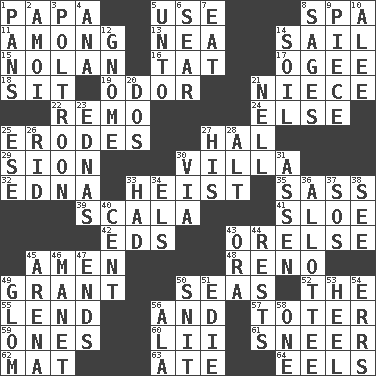 ACROSS 1. Dad 5. Purpose 8. Health resort 11. Amid 13. Teachers' org. 14. Move on water 15. Pitcher Ryan 16. Make lace 17. Double curve, resembling the letter S 18. Be seated 19. Aroma 21. Sibling's daughter 22. San ____ (Riviera town) 24. Otherwise 25. Eats (away) 27. Actor Linden 29. The Jewish people; Israel 30. Country residence 32. Pulitzer Prize-winning author Ferber 33. Robbery 35. Backtalk 39. Any of the three canals of the cochlea 41. _ gin 42. Begley and Asner 43. Threatening words 45. So be it 48. Former U.S. Attorney General Janet 49. Monetary aid 50. Oceans 52. Definite Article 55. Grant temporary use of 56. Also 57. Carrier 59. Singles 60. Cards in a Roman deck? 61. Contemptuous expression 62. Floor covering 63. Had dinner 64. Snakelike fish DOWN 1. Baking dishes 2. Mine, in Marseilles 3. Coward 4. Santa ___, CA 5. To (old English) 6. Singe 7. Consume 8. Gurus 9. Component 10. Toward shelter 12. Dwarf 14. Land 20. Two (Sp.) 21. 1994 drama film starring Jodie Foster 23. Ferber et al. 25. Compass dir. 26. To free from 27. Part of HMS, perhaps 28. Keyboard modifier key 30. By way of 31. NE Netherlands city 33. Possessed 34. Raised railways 36. One to whom something is allotted 37. Distress signal 38. Perceive with the eye 40. Penny 43. Mouth or opening 44. Musical pauses 45. Sports stadium 46. French painter Edouard 47. Conclusions 49. Take by theft 50. In a ____ (agitated or irritated) 51. Singer Brickell 53. The bottom of a shoe or boot 54. Blunders 56. According to 58. Single