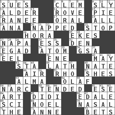 ACROSS 1. Takes to court 5. Clement's nick name 9. Insidious 12. Tree or shrub in the Birch family 14. Be footloose 15. Sliced dessert 16. Indian princess (variant) 17. Relating to the mouth 18. Everything 19. Santa ___, CA 20. Slept 23. Halt 24. Israeli folk dance 25. Makes supply last 27. California wine valley 30. Double-curved letter 32. Lair 33. Mild oath 34. Tiny particle 36. Girls' org. (abbr.) 38. Snakelike fish 39. Compass dir. 40. Fifth month 43. R.R. building 46. Thin strip of wood or metal 48. Nathan's nickname 49. Wind 51. 17th letter of the Greek alphabet 52. "______ My Girl" (Turtles hit) 53. _ mater 54. Norwegian king 56. Drug cop 58. Looked after 61. Compass dir. 64. Tate display 65. "You Light Up My Life" star Conn 66. Peak District village in England 68. _-fi 69. Christmas carol 70. Rhinal 71. Definite Article 72. Queen of England 1702-14 73. Stakes DOWN 1. "Two Mules for Sister ____" 2. ____ Bator, Mongolia 3. Pulitzer Prize-winning author Ferber 4. Observe 5. Riding implement 6. Old wives' tales, e.g. 7. Eluded 8. Cartoonist voice _ Blanc 9. Arguments over trivial matters 10. _ and Stitch 11. Sharp bark 13. Former U.S. Attorney General Janet 21. Type of rug 22. Soft color 23. Elected reps. 24. Possessed 26. Cask 27. Born 28. Ripen 29. Friends 31. Underwater navigation system 35. Mode 37. Housemaid 41. Had dinner 42. It is so 44. Baby powder 45. Direct toward a target or goal 47. Opening into or through something 48. Science/research agcy. 50. Food allowance for one day 53. Nick name for Arthur 55. Arabian gulf 56. Political cartoonist Thomas 57. Bowlike part 59. Paradise 60. "Death on the ____" 61. Relaxation 62. Narrow board 63. Snakelike fish 65. Heredity factor (abbr.) 67. Pat or tap gently