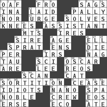 ACROSS 1. Clumsy lout 4. From 7. Sinks 11. _ tizzy (2 wds.) 12. Put down 13. Friendly 14. Not either 15. Goad 16. Finds the solution 17. Leg joints 19. Helper 21. Mountains (abbr.) 23. Angers 24. Beget 25. Grow older 26. Pipe bend 29. Small fatty European fish 30. Followers of ems 31. Pass on 32. For each 33. Big collection agency 34. Tired old horse 35. The 19th letter of the Greek alphabet 36. _-fi 37. Witty Wilde 40. "We ___ not amused" (Victoria) 41. Area sheltered from the wind 42. Vintage cars 43. Examine hastily 45. Feline 46. Conclusion 51. Desist 55. Foolish or stupid persons 56. Billionth: prefix 58. Health resort 59. Impressive in appearance 60. Group working together 61. Greek goddess of the dawn 62. Celtic language 63. Environmental prefix 64. Had dinner DOWN 1. Pig sound 2. Soon (poet.) 3. Conductor's collection 4. Distant 5. Port city in Latvia 6. Lyric poems 7. Table seasonings 8. Inventor's middle name 9. Small, secluded valley 10. System (abbr.) 12. A period of five years 13. Airs 16. Founders of families 18. Independent ruler or chieftain 20. Public displays of written messages 22. Put into a specified state 24. Upset 25. Nest on high 26. Ferber et al. 27. One who doesn't tell the truth 28. Part of a journey 29. Dry up 32. Parent Teacher Association (abbr.) 33. Ancient Celtic tribe of eastern Britain 36. Narrow boards 37. The grampus (Milton) 38. Manatee 39. ____ d'Azur (French Riviera) 43. Fur scarf 44. Quote 46. Trig term 47. Scent 48. Teases 49. Single time 50. Drug cop 52. Toward the sea 53. Specific locale 54. Relaxation 57. Modern: prefix