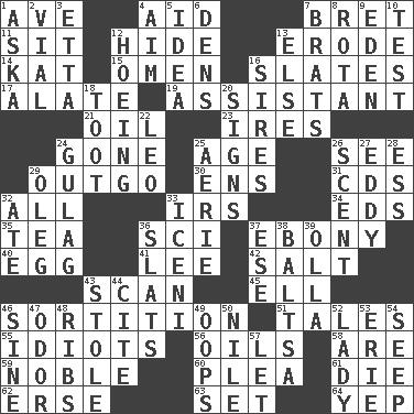 ACROSS 1. "___ Maria" 4. Assist 7. Cy Young winner Saberhagen 11. Be seated 12. Flintstone garb 13. Wear away 14. Krazy ___ of comics 15. Presage 16. Chalkboards 17. Having winglike extensions 19. Helper 21. Petroleum 23. Angers 24. Went 25. Mature 26. Observe 29. Money paid out 30. Followers of ems 31. Music discs 32. 100% 33. Big collection agency 34. Begley and Asner 35. Afternoon social gathering 36. _-fi 37. Black 40. Oval reproductive body of a fowl 41. Area sheltered from the wind 42. Table seasoning 43. Glance over 45. Pipe bend 46. Conclusion 51. Lies 55. Foolish or stupid persons 56. Lubricates 58. "We ___ not amused" (Victoria) 59. Having high moral qualities 60. Entreaty 61. Pass on 62. Celtic language 63. Put into a specified state 64. Slangy assent DOWN 1. "____ silly question..." 2. Small bottle 3. Singer James 4. Direct toward a target or goal 5. The content of cognition 6. Habitations of wild animals 7. Naughty children 8. Roll call or roster of names 9. Genesis locale 10. Trial 12. Weeding 13. Otherwise 16. Founders of families 18. A blast of a horn 20. Public displays of written messages 22. Lion 24. Russian prison camp 25. Nest on high 26. Odor 27. Whirlpool 28. Double-curved letter 29. Cassini of fashion 32. Had dinner 33. Ancient Celtic tribe of eastern Britain 36. Narrow boards 37. Compass dir. 38. Greek mezzo-soprano Agnes 39. Spanish pot 43. Took without asking 44. Quote 46. Trig term 47. Scent 48. Chest bones 49. I made a mistake 50. Mediterranean tributary 52. Kenny Rogers chart-topper in '80 53. One of the Great Lakes 54. Ooze 57. Allow