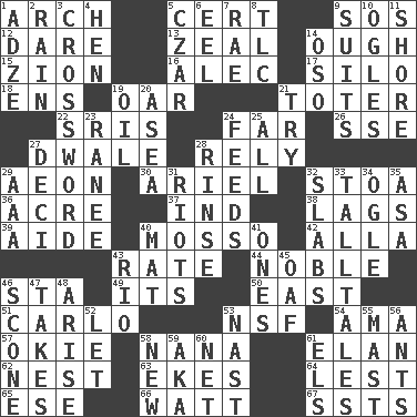 ACROSS 1. Bowlike part 5. Sure thing 9. Distress signal 12. Have the gumption 13. Ardor 14. Ending for "Through" and "Enough" 15. The Jewish people; Israel 16. Actor Baldwin 17. Grain storage tower 18. Followers of ems 19. Boat paddle 21. Carrier 22. Indian titles of respect 24. At a great distance 26. Compass dir. 27. A sleeping potion; an opiate (poet.) 28. Depend 29. A really long time 30. Satellite of Uranus 32. Portico 36. 1/640 square mile 37. Indiana (abbr.) 38. Fails to keep up a pace 39. Assistant 40. With motion or animation 42. Silent film actress Nazimova 43. Assign a rank or rating to 44. Having high moral qualities 46. R.R. building 49. It is 50. Compass direction 51. Monte _, Las Vegas Hotel/Casino 53. Overdraft (abbr.) 54. Nanny (var.) 57. Migrant worker of the '30s 58. Grandmother 61. Flair 62. Egg locale 63. Supplements with great effort 64. For fear that 65. Compass dir. 66. Electrical Unit 67. Fast planes DOWN 1. Edge tool used to cut and shape wood 2. Precipitation 3. What you're doing now 4. Layer 5. Russian ruler of old 6. Snakelike fish 7. Actress Charlotte 8. Affectionate concern, for short 9. Sets or collections 10. Stares 11. Dinah or Pauly 14. Bear (Spanish) 19. Lubricate 20. At sea 21. Attempt to accomplish something 23. Indian princess (variant) 24. Gives food to 25. Everything 27. Tenth: prefix 28. Wash lightly 29. Auto club (abbr.) 31. Disturbances 32. Broad, flat, thick pieces 33. Baron Munchausen's specialties 34. Stare 35. White ___ sheet 40. Floor covering 41. Washington bills 43. River (Sp.) 45. Clumsy lout 46. Biscuitlike quick bread 47. Receives possession of 48. Ascend 52. Allow 53. Political cartoonist Thomas 55. Vertical spar for supporting sails 56. Pismires 58. ___ Haven, CT 59. Alias (abbr.) 60. Remaining after all deductions 61. Raised railways