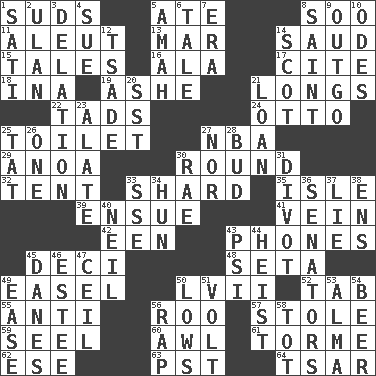 ACROSS 1. Beer foam 5. Had dinner 8. "Barney Miller" actor Jack 11. Eskimo relative 13. Make imperfect 14. Saudi Arabian king (1953-1964) 15. Stories 16. In the manner of 17. Quote 18. _ tizzy (2 wds.) 19. American tennis player Robert 21. Yearns 22. Bits 24. Von Bismarck 25. Bathroom 27. Basketball assoc. 29. Small Philippine buffalo 30. One shot 32. Portable shelter 33. Pottery fragment 35. Small island 39. Follow as a consequence or result 41. Distinctive style or manner 42. Car or cant ending 43. Gives a jingle 45. Tenth: prefix 48. Bristle 49. Artist's stand 50. 57 in ancient Rome 52. Bar bill 55. Against 56. Friend of Pooh 57. Fur scarf 59. Stitch closed the eyes of (a falcon) 60. Leather borer 61. Singer Mel 62. Compass dir. 63. Pacific Standard Time (abbr.) 64. Russian ruler of old DOWN 1. Suttee (variant) 2. Uhlan (variant) 3. Accusation by an informer 4. Institute legal proceedings 5. Nursemaid 6. Story 7. Period 8. Inhabitant of Heaven 9. Outlay 10. Lyric poems 12. Sadhe (variant) 14. Highlander 20. Fast jet (abbr.) 21. Grant temporary use of 23. Having winglike extensions 25. Make lace 26. Single 27. And not 28. Partially opened flower 30. Actress Charlotte 31. A piece of turf (Scot.) 33. Compass dir. 34. Attila the _ 36. Elected representatives 37. Untruth 38. Followers of ems 40. Famous astronaut Armstrong 43. 23rd letter of the Greek alphabet 44. Robbery 45. Natives or inhabitants of Denmark 46. First name in cosmetics 47. To provide with a ceiling 49. Relaxation 50. Coldest temperatures 51. Electrical Unit 53. _ mater 54. Fermented drink made from hops 56. Strike 58. Small child
