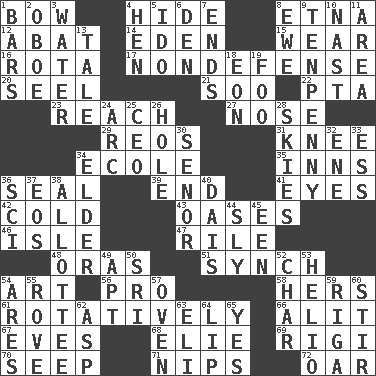 ACROSS 1. Arrow shooter 4. Flintstone garb 8. Inactive volcano in Sicily 12. Blind as ____ 14. Genesis locale 15. Erode 16. Roll call or roster of names 17. Unrelated to defense, as in spending 20. Stitch closed the eyes of (a falcon) 21. "Barney Miller" actor Jack 22. Parent Teacher Association (abbr.) 23. Arrive at 27. Olfactory organ 29. Vintage cars 31. Leg joint 34. Learning spot: Fr. 35. Taverns 36. Lick closed 39. Conclusion 41. Snake ____ (dice throw) 42. Chilled 43. Fertile tracts in a desert 46. Capri or Wight 47. Cause heat under the collar 48. Mouths or openings 51. Synchronize (abbr.) 54. Tate display 56. Adept person 58. Possessive pronoun 61. Rotating or pertaining to rotation 66. Came down and settled, as after flight 67. Nights before holidays 68. Writer Wiesel 69. Swiss mountan, "Queen of the Mountains" 70. Ooze 71. Cuts off 72. Rowing implement DOWN 1. Oblong pieces of solid material 2. Mitch Miller's instrument 3. Wetness 4. Layer 5. Wedding promise 6. Lair 7. Conclusions 8. She-sheep 9. 3-inch nail 10. Political cartoonist Thomas 11. Length times width 13. Story 18. A really long time 19. Egg _ yung 24. Curve 25. Corporate head (abbr.) 26. Hollow 28. Atmospheres 30. Sir (Sp.) 32. Compass dir. 33. Double-curved letter 34. A person who is older than you are 36. _-fi 37. Greek goddess of the dawn 38. One to whom something is allotted 40. Raised platform 44. Cunning 45. Car or cant ending 49. Fitting 50. Indian title of respect (Mr.) 52. Burn to charcoal 53. Sun: prefix 54. Ancient Greek god of war 55. Be footloose 57. Baking chamber 59. Capital of Latvia 60. Use a spoon 62. Viper 63. Connecticut Ivy Leaguer 64. Mouth edge 65. Consenting reply