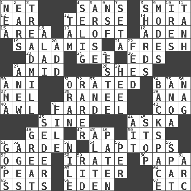 ACROSS 1. Remaining after all deductions 4. Without 8. Stricken, poetically 12. Hearing organ 13. Laconic 14. Israeli folk dance 15. Length times width 17. At or to great height 18. An important port of Yemen 19. Deli grouping 21. Anew 23. Male parent 24. Turn to the right 26. Begley and Asner 27. Among 28. "______ My Girl" (Turtles hit) 30. Black tropical American cuckoo 31. Declaimed 34. Bar 37. Cartoonist voice _ Blanc 38. The wife of a rajah (variant) 39. Santa ___, CA 40. Leather borer 41. Pack 42. Gear tooth 43. Trig term 44. "____ silly question..." 46. Set 47. Reproach for some lapse or misdeed 50. It is 51. Place where plants grow 54. Portable computers 57. Double curve, resembling the letter S 58. Feeling or showing extreme anger 60. Dad 62. Lightbulb-shaped fruit 63. 61 cubic inches 64. 4-wheeled motor vehicle 65. Fast planes 66. Paradise 67. And so on (abbr.) DOWN 1. Teachers' org. 2. Hearing organs 3. Excercise machine 4. Former Milwaukee Brewers owner Bud 5. Came up 6. Overdraft (abbr.) 7. Stalk of a moss capsule 8. Broken pieces 9. Methods 10. Angers 11. Hyperbolic tangent 13. Scottish cap 16. Jai ____ 20. Increase 22. Nourish 25. First name in cosmetics 27. Afresh 29. The bottom of a shoe or boot 30. Housemaid (var.) 31. Northwest Algerian city 32. More valued for its uncommonness 33. Plus 34. Keyboard key 35. Small Philippine buffalo 36. Tired old horse 41. Do some clerical work 43. Spring feasts 44. Small island 45. Obstruct or block passage 46. Relatively large 48. Having winglike extensions 49. Eucharist need 51. Republicans 52. Matures 53. Mediterranean tributary 55. For each 56. Petty quarrel 59. To free from 61. Curve