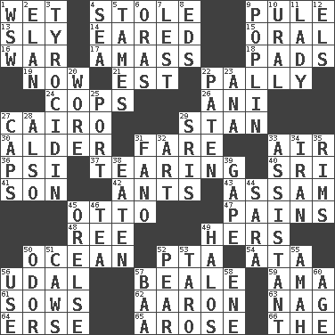 ACROSS 1. Soggy 4. Took without asking 9. Whimper 13. Stealthy 14. Having ears or earlike features 15. Relating to the mouth 16. Armed conflict 17. Collect or gather 18. Groovy apts. 19. Immediately 21. Eastern Standard Time (abbr.) 22. Chummy 24. 911 reaches them 26. Black tropical American cuckoo 27. Capital of Egypt 29. Comedian Laurel of Laurel & Hardy 30. Tree or shrub in the Birch family 31. Conductor's collection 33. Atmosphere 36. 23rd letter of the Greek alphabet 37. Separating forcefully 40. _ Lanka 41. Manchild 42. Pismires 43. Indian state 45. "Beetle Bailey" pooch 47. Aches 48. To separate or throw off 49. Possessive pronoun 50. Sea 52. Parent Teacher Association (abbr.) 54. "One Day ___ Time" 56. Freehold land 57. Calif. Air Force Base 59. Nursemaid (var.) 61. Sty mamas 62. Composer Copland 63. Tired old horse 64. Celtic language 65. Came up 66. Definite Article DOWN 1. Compass dir. 2. Flair 3. Polypeptide antibiotic 4. Ocean 5. Domesticates 6. Mouths or openings 7. For fear that 8. Begley and Asner 9. Cotton for raincoats, e.g. 10. Mountain range 11. Kenny Rogers chart-topper in '80 12. Raised railways 20. Had on 22. Eucharist need 23. Santa ___, CA 25. Sweet dark-red dessert wine 27. Smile enhancers 28. In addition 29. Indian titles of respect 31. Papal veil 32. Tate display 33. Aide 34. SW Asia republic 35. Basketball hoops 38. Ingested 39. Yawn 44. "Two Mules for Sister ____" 45. Threatening words 46. Beverage made from leaves 49. Rings 50. Aroma 51. Crow sounds 52. Lightbulb-shaped fruit 53. Edible starchy tuberous root 55. Nanny 56. Purpose 57. Sound made by sheep 58. Compass dir. 60. Grow older