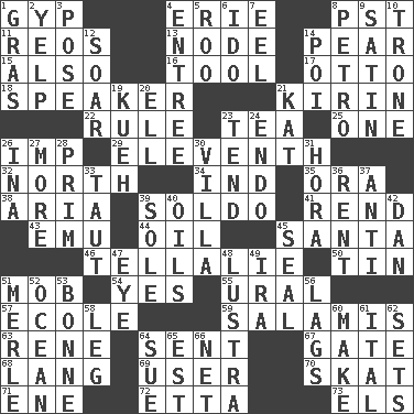 ACROSS 1. Flimflam 4. One of the Great Lakes 8. Pacific Standard Time (abbr.) 11. Vintage cars 13. Connecting point 14. Lightbulb-shaped fruit 15. In addition 16. Utensil 17. "Beetle Bailey" pooch 18. Orator 21. Japanese brewing company 22. General guideline 23. Afternoon social gathering 25. Single 26. Mischievous child 29. Veterans Day date 32. 0 degrees 34. Working for oneself (abbr.) 35. Mouth or opening 38. Roberta Peters solo 39. Twentieth part of a lira 41. Tear apart 43. Australian flightless bird 44. Lubricate 45. Before Barbara or Clara 46. Copy Pinocchio 50. Shallow baking pan 51. Crowd into 54. Affirmative reply 55. Mountain range 57. Learning spot: Fr. 59. Deli grouping 63. French philosopher Descartes 64. Transmitted 67. Yard entry 68. Austrian-born American filmmaker Fritz 69. One who makes use of a thing 70. Three-handed card game 71. Compass dir. 72. Singer James 73. Raised railways DOWN 1. Pate de foie ____ 2. Sharp bark 3. Airs 4. Main course 5. Friend of Pooh 6. Wedding promise 7. Snakelike fish 8. Stone: prefix 9. Smooth fabric 10. Heavy duty weighing machine 12. Fly high 14. Luau course 19. Malaysian steamed pastry 20. Pipe bend 21. Krazy ___ of comics 23. Look after 24. Inside; within (prefix) 26. _ tizzy (2 wds.) 27. Greater amount 28. Demure 30. Country estate 31. Israeli folk dance 33. Drawn tight 36. Monthly bill 37. Opposed to 39. Flatfish 40. Lubricates 42. One of the 12 tribes of Israel 45. Lick closed 47. Sight organ 48. A period of five years 49. Lyricist Gershwin 51. Haggard of country music 52. Sea 53. Maid-servant 56. Fails to keep up a pace 58. Part of a journey 60. Cause to be 61. Slanted text style (abbr.) 62. Puts into a specified state 64. Institute legal proceedings 65. Eastern Standard Time (abbr.) 66. Fish or hair follower