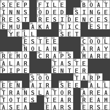 ACROSS 1. Ooze 5. Do some clerical work 9. Water vessel 13. Restaurants 14. Wrote a lyric poem 15. Scorch 16. Remainder 17. Homes 19. Australian flightless bird 20. Alias (abbr.) 21. Nervous spasm 22. Eastern Standard Time (abbr.) 23. Shout 25. Arrange properly for use 26. First name in cosmetics 30. Calm and collected 34. Pitcher Ryan 35. Like ___ of sunshine 36. San ____ (Riviera town) 39. Dice game 42. Female horse 43. Having or resembling wings 44. Clothes sense 46. Corncob 47. Keyboard key 48. "Barney Miller" actor Jack 51. Canvas cover 54. Car or cant ending 57. Wind 58. Observe 60. Everything 62. Interpreter 65. Type of rug 66. Lugs 67. Pull into pieces 68. 480, 500 or 516 sheets of paper 69. Toward the sea 70. Hearing organs 71. Celtic language DOWN 1. Father 2. Foe 3. Follow as a consequence or result 4. Pacific Standard Time (abbr.) 5. Tined utensil 6. It may be bright or harebrained 7. French article 8. Prepares for publication 9. Storage container 10. At one time in the past 11. Ripens 12. Trial 15. Religious group 18. Expire 20. In addition 24. Poe poem 27. Affectionate concern, for short 28. Ewer handle 29. Related on the mother's side 30. Device for capturing images 31. Mouth or opening 32. Rowing implement 33. Sodium hydroxide 36. Reproach for some lapse or misdeed 37. Biblical high priest 38. Atlas unit 40. Baking dish 41. Fast jet (abbr.) 45. False hair 48. Backtalk 49. Lubricate 50. Declaim 52. More uncommon 53. Entreaties 54. Singer James 55. Greek god of love 56. Nathan's nickname 58. Fly high 59. Blunders 61. Unable to walk 63. Teachers' org. 64. Beverage made from leaves 65. "We ___ not amused" (Victoria)
