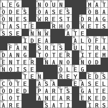 ACROSS 1. Part of a journey 4. Part of speech 8. Floor protector 11. Lyric poems 13. Fertile tracts in a desert 15. Chief or king in Benin or Nigeria 16. Washington bills 17. Obtain by seizing forcibly or violently 18. To be drawn or hauled along 19. Clothes sense 21. 17th letter of the Greek alphabet 22. Soaks 23. Compass dir. 24. Compass dir. 27. Had dinner 29. The main thing one is thinking about 30. At or to great height 34. Air blower 36. Indian titles of respect 39. Extremist 40. Mild oath, euphamism for damn 41. Carrier 43. A whole individual unit 44. Keyboard key 46. Billionth: prefix 47. Lower and raise head in agreement 48. Annoying sound 49. Cassini of fashion 51. Nine, plus one 53. Marina Del _, California 54. Begley and Asner 57. ____ d'Azur (French Riviera) 60. White ___ sheet 63. Artist's stand 65. Wrote a lyric poem 66. Actors' quests 69. Yard entry 70. Car dealer's back yard 71. Approach 72. Supplemented with great effort 73. "We ___ not amused" (Victoria) 74. Suttee (variant) 75. Big collection agency DOWN 1. Plunders 2. Ferber et al. 3. Honkers 4. Immediately 5. Boat paddle 6. One who makes use of a thing 7. Tender 8. Greater amount 9. Blind as ____ 10. Labels 12. Fast jet (abbr.) 14. Portico 18. Residence 20. Conclusion 25. Egg locale 26. Make _____ (do battle with) 28. The 19th letter of the Greek alphabet 29. Consumed 31. "Beetle Bailey" pooch 32. Flintstone 33. Scottish cap 34. Papal veil 35. Opposed to 37. Call ___ day 38. Sir (Sp.) 40. Lair 42. Hero or heavy, e.g. 45. To riddle 50. Sight organ 52. California wine valley 54. 1973 Nobel Price Winner (Physics) Leo 55. Prevent from occurring 56. Bobsleighs 57. Root beer relative 58. Aroma 59. Wig 61. Without 62. Type of rug 64. Personal question 67. Make lace 68. _ Lanka