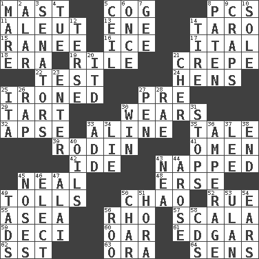 ACROSS 1. Vertical spar for supporting sails 5. Gear tooth 8. Personal Computers (abbr.) 11. Native American of Southwest Alaska 13. Compass dir. 14. Edible starchy tuberous root 15. The wife of a rajah (variant) 16. Frozen water 17. Slanted text style (abbr.) 18. Epoch 19. Cause heat under the collar 21. Streamer paper 22. Trial 24. Coop moms 25. Pressed 27. Before (prefix) 29. Small pie 30. Puts on (as clothing) 32. Domed church section 33. Place in a line 35. Falsehood 39. "The Thinker" sculptor 41. Sign of things to come 42. Binary compound 43. Slept 45. Anneal 48. Celtic language 49. For Whom the Bell _____ 50. US Secretary of Labor Elaine L. _ 52. Regret 55. Toward the sea 56. 17th letter of the Greek alphabet 57. Any of the three canals of the cochlea 59. Tenth: prefix 60. Rowing implement 61. _ Allan Poe 62. Fast jet (abbr.) 63. Mouth or opening 64. Elected reps. DOWN 1. Female horse 2. Having or resembling wings 3. Legislators 4. Third day of the wk. 5. To provide with a ceiling 6. Single time 7. Turn to the right 8. Eucharist need 9. Dice game 10. Flatfish 12. Laconic 14. Hoop that covers a wheel 20. It would 21. "Mermaids" star 23. Keyboard key 25. Call ___ day 26. Reproach for some lapse or misdeed 27. Writing instrument 28. Actress Charlotte 30. Victory 31. Ceases 33. Find the sum of 34. Falsehood 36. Electrical Measurement 37. Area sheltered from the wind 38. Conclusion 40. Petroleums 43. Teachers' org. 44. Came up 45. Olfactory organs 46. Voters do this 47. Jai ____ 49. Small boys 50. Burn to charcoal 51. Israeli folk dance 53. ____ Bator, Mongolia 54. Hearing organs 56. Friend of Pooh 58. Music discs