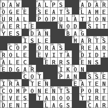 ACROSS 1. Obsolete 4. High mountains 8. The sixth month of the Jewish calendar 12. Double curve, resembling the letter S 14. Theater features 16. Unable to walk 17. Mountain range 18. Census information 20. Nest on high 22. Lower and raise head in agreement 23. Be seated 24. Affirmative reply 25. Daniel's nick name 28. Paper or plastic container 30. Small island 31. Shops 35. Police officer (slang) 37. Mouths or openings 40. Hitchcock's "____ Window" 41. Hero or heavy, e.g. 42. Webber/Rice musical 44. "You Light Up My Life" star Conn 45. Actor Baldwin 46. Blunders 47. Followers of ems 48. _ Allan Poe 50. Visual representation of an object 52. Small bed 54. Baking dish 55. Compass dir. 58. Retirement account (abbr.) 61. Nine, plus one 63. Consumed 65. Pieces 70. Sweet dark-red dessert wine 71. Nights before holidays 72. Off limits 73. Hoop that covers a wheel 74. Gouge 75. Fails to keep up a pace 76. 4-wheeled motor vehicle DOWN 1. A city in N France, SE of Calais 2. Match 3. Erodes 4. Cleo's killer 5. Lion 6. Infant food 7. Make senseless or dizzy 8. Keyboard modifier key 9. Raised platform 10. Mine, in Marseilles 11. Monthly bill 13. Biblical high priest 15. Messy guy 19. First of billions? 21. Begley and Asner 26. _ vera 27. Effrontery 29. Place where plants grow 30. Medicinal drug used to evoke vomiting 32. It's straight from the horse's mouth 33. Small boys 34. Indian title of respect (Mr.) 35. Lacking warmth 36. Cassini of fashion 38. Atmosphere 39. Long narrow piece of something 41. Actress Charlotte 43. "____ silly question..." 49. Printing process, for short 51. Single 53. Portable shelter 55. Unemotional 56. Spanish missionary in California 57. Keyboard key 58. On the rocks 59. Be footloose 60. So be it 62. Anneal 64. Fitting 66. Pacific Standard Time (abbr.) 67. Basketball assoc. 68. Coat; cloak 69. Distress signal