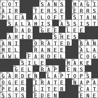 ACROSS 1. Small bed 4. Without 8. Wise men 12. Atmosphere 13. Laconic 14. Blunders 15. Entreaty 17. Upward 18. Comedian Laurel of Laurel & Hardy 19. Deli grouping 21. Help 23. June honoree 24. Turn to the right 26. Area sheltered from the wind 27. Among 28. "______ My Girl" (Turtles hit) 30. Cuckoo 31. Spoke pompously 34. Forbid 37. Cartoonist voice _ Blanc 38. Indian princess (variant) 39. According to 40. Leather borer 41. Pack 42. Gear tooth 43. Filth; sediment 44. Cause to be 46. Set 47. Strike 50. Followers of ems 51. Place where plants grow 54. Portable computers 57. Double curve, resembling the letter S 58. Feeling or showing extreme anger 60. California wine valley 62. Lightbulb-shaped fruit 63. 61 cubic inches 64. Feline 65. Fast planes 66. Paradise 67. Compass dir. DOWN 1. Head covering 2. Petroleums 3. Excercise machine 4. Former Milwaukee Brewers owner Bud 5. Came up 6. Science/research agcy. 7. Bristle 8. Makes clutter 9. Nick name for Arthur 10. Pate de foie ____ 11. Is not 13. Scottish cap 16. Jai _ 20. Find the sum of 22. Downhill vehicle 25. First name in cosmetics 27. Afresh 29. The bottom of a shoe or boot 30. Nursemaid (var.) 31. Spoken 32. More valued for its uncommonness 33. Plus 34. Keyboard key 35. Medicinal plant 36. Tired old horse 41. Do some clerical work 43. Spring feasts 44. Was introduced to 45. At once, immediately (arch.) 46. Relatively large 48. Having winglike extensions 49. Eucharist need 51. Republicans 52. Ripens 53. Mediterranean tributary 55. For each 56. Connect, as a bridge 59. To free from 61. Had dinner
