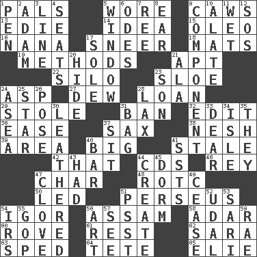 ACROSS 1. Friends 5. Had on 9. Crow sounds 13. Singer Brickell 14. It may be bright or harebrained 15. Butter sub 16. Grandmother 17. Scornful expression 18. Floor coverings 19. Modes 21. Fitting 22. Grain storage tower 23. A type of plum 24. Cleo's killer 27. Morning condensation 28. Grant temporary use of 29. Took without asking 31. Bar 32. Prepare for publication 36. Relaxation 37. Saxophone 38. Tender 39. Type of rug 40. Massive 41. Having lost freshness 42. Not this but _ 44. Music discs 46. Marina Del _, California 47. Burn to charcoal 48. College mil. group 50. Directed 51. Son of Zeus who helped slay Medusa 54. Composer Stravinsky 56. Indian state 58. The sixth month of the Jewish calendar 60. Be footloose 61. Repose 62. "Two Mules for Sister ____" 63. Drove too fast 64. False hair 65. Writer Wiesel DOWN 1. Writing instrument 2. First man 3. Actor's bit 4. Theater features 5. Light entry point 6. Lyric poems 7. To sift 8. Ewer handle 9. Piece 10. Having winglike extensions 11. Soggy 12. Distress signal 17. Not divided or shared with others 20. Flintstone garb 21. Insect wing 23. Male offspring 24. At sea 25. Play the lead 26. Airs 28. Not strict 30. Resembling or made to resemble leather 31. Paper or plastic container 33. Letter starter 34. Small island 35. Those people 37. Be seated 40. Drinking establishment 41. Fast planes 43. Possessed 44. Make 45. Dormintory (informal) 47. Garlic unit 49. Desist 51. Inconspicuous attention getter 52. Hereditary estate 53. Indian skirt 54. Big collection agency 55. Grand Old Party 56. Tate display 57. Perceive with the eye 59. Actress Charlotte