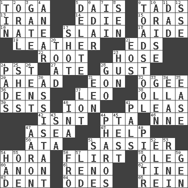 ACROSS 1. Ancient Roman robe 5. Raised platform 9. Bits 13. SW Asia republic 14. Singer Brickell 15. Mouths or openings 16. Nathan's nickname 17. Killed 18. Assistant 19. Cordwainer's material 21. Begley and Asner 22. Carrot, for example 23. Stockings 24. Pacific Standard Time (abbr.) 27. Had dinner 28. Abrupt rush of wind 29. Having the leading position 31. Period of immesurable duration 32. Double curve, resembling the letter S 36. Cub Scout units 37. Lion 38. Water jar 39. Fast planes 40. Electrically charged atom 41. Entreaties 42. Is not 44. Parent Teacher Assoc. 46. Compass dir. 47. Toward the sea 48. Assist 50. _ moment's notice (2 wds.) 51. More impudent 54. Israeli folk dance 56. Seductive woman who exploits men 58. Cassini of fashion 60. Soon (poet.) 61. Former U.S. Attorney General Janet 62. Prong on a fork 63. Undesirable depression on a surface 64. Lyric poems 65. It's straight from the horse's mouth DOWN 1. Metal container 2. Taken by mouth 3. Yard entry 4. Approach 5. Erase 6. The sixth month of the Jewish calendar 7. One more than two 8. Elected rep. 9. Inedible or poisonous agaric 10. Get up 11. June honoree 12. Compass dir. 17. Guess 20. Frog relative 21. Greek goddess of the dawn 23. Attila the _ 24. Writing tablets 25. "______ My Girl" (Turtles hit) 26. Portable shelter 28. Thick or sticky substance 30. Aide 31. Car or cant ending 33. Small, secluded valley 34. Flair 35. Relaxation 37. Car dealer's back yard 40. _ tizzy (2 wds.) 41. Friends 43. Ocean 44. N Egypt peninsula 45. Trial 47. Composer Copland 49. Peter (Polish) 51. Trig term 52. Writer Wiesel 53. Painter Guido (1575-1642) 54. Possessed 55. Single 56. Back 57. Directed 59. Commissioned military rank (abbr.)