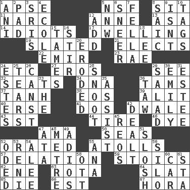 ACROSS 1. Domed church section 5. Overdraft (abbr.) 8. Be seated 11. Drug cop 12. Queen of England 1702-14 13. White ___ sheet 14. Foolish or stupid persons 17. Home 19. Scheduled 21. Opts 22. Arab leader 23. Actress Charlotte 24. And so on (abbr.) 27. Greek god of love 29. Observe 32. Theater features 34. Heredity factor (abbr.) 36. Scottish caps 37. Hyperbolic tangent 38. Greek goddess of the dawn 39. Came down and settled, as after flight 40. Celtic language 41. Two (Sp.) 42. A sleeping potion; an opiate (poet.) 43. Fast jet (abbr.) 44. Become fatigued 46. Color 47. Nursemaid (var.) 50. Oceans 52. Declaimed 55. Ringlike coral islands and reefs 57. Conveyance 59. Unemotional ones 62. Compass dir. 63. Round or rotation of duties 64. Narrow board 65. Expire 66. Eastern Standard Time (abbr.) 67. Israeli folk dance DOWN 1. Cuckoo 2. Writing tablet 3. Indian titles of respect 4. Learning spot: Fr. 5. Compass dir. 6. Contemptuous expression 7. Chap (slang) 8. Ketch in the Levant 9. Is not 10. Labels 12. Increase 15. Softens 16. Use a swizzle stick 18. Area sheltered from the wind 20. Worn away 24. _____ Park, CO 25. Separates forcefully 26. 2nd pers. sing. pres. of can (arch.) 28. Snout, nose 29. First course 30. Poet Dickinson 31. First name in cosmetics 33. Definite Article 35. Help 36. The 23rd letter of the Hebrew alphabet 42. Started a card game 45. Vintage cars 47. _ moment's notice (2 wds.) 48. Distance measurement (Brit.) 49. Goodbye (Sp.) 51. Splash clumsily 52. Wrote a lyric poem 53. Painter Guido (1575-1642) 54. Toward shelter 55. Santa ___, CA 56. Grain storage tower 58. Baseball player Mel 60. Automobile 61. R.R. building