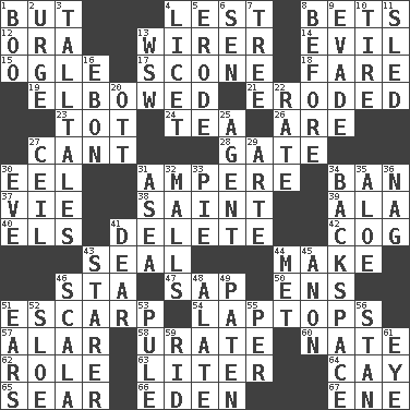 ACROSS 1. With the exception that 4. For fear that 8. Antes 12. Mouth or opening 13. One who wires 14. Morally bad or wrong 15. Stare 17. Biscuitlike quick bread 18. Conductor's collection 19. Turned at an angle; bent 21. Worn away 23. Small child 24. Afternoon social gathering 26. "We ___ not amused" (Victoria) 27. Patter 28. Yard entry 30. Snakelike fish 31. Electrical Unit 34. Forbid 37. Compete 38. Inhabitant of Heaven 39. Insect wing 40. Raised railways 41. Keyboard key 42. Gear tooth 43. Lick closed 44. Create 46. R.R. building 47. Plant excrement 50. Followers of ems 51. Fortification 54. Portable computers 57. Having or resembling wings 58. A salt of uric acid 60. Nathan's nickname 62. Hero or heavy, e.g. 63. 61 cubic inches 64. Island 65. Singe 66. Genesis locale 67. Compass dir. DOWN 1. Sometimes accompanies a hiss 2. Goad 3. Baron Munchausen's specialties 4. It is permitted: Lat. 5. Eat (away) 6. Elected rep. 7. Relationship diagram 8. Prior to 9. Elude 10. Hoop that covers a wheel 11. Downhill vehicle 13. Compass dir. 16. Inky black, to poets 20. Baseball player Mel 22. Pace 25. Rep 27. To provide with a ceiling 29. Johnson of "Laugh-In" 30. Night before a holiday 31. Toward the sea 32. Shopping centers 33. Sliced dessert 34. Keyboard key 35. _ vera 36. Tired old horse 41. Letter starter 43. A viewer who gazes fixedly 44. Was introduced to 45. Soon (poet.) 46. Any of the three canals of the cochlea 48. Having winglike extensions 49. Eucharist need 51. Hearing organs 52. A type of plum 53. Whimper 55. For each 56. Comedian Laurel of Laurel & Hardy 59. To free from 61. Sight organ