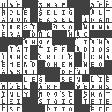 ACROSS 1. Order of Saint Francis (abbr.) 4. Fastener 8. Observe 11. Hero or heavy, e.g. 13. Former Milwaukee Brewers owner Bud 15. The first octave above the treble staff 16. At once, immediately (arch.) 17. Artist's stand 18. SW Asia republic 19. Tarsus (plural) 21. Bear (Spanish) 22. Nanny 23. Period 24. The grampus (Milton) 27. Apple computer (short form) 29. Small Philippine buffalo 30. Woody, climbing, usually tropical plant 34. Make lace 36. Small quarrel 39. Goodbye (Sp.) 40. Edible starchy tuberous root 41. Small stream 43. Pulitzer Prize-winning author Ferber 44. Make improvements or corrections to 46. Presage 47. Modern: prefix 48. Slender Brazilian palm 49. Undesirable depression on a surface 51. French article 53. Elected rep. 54. Whopper 57. Christmas carol 60. Sandy's bark 63. Puts on (as clothing) 65. Inwardly 66. Trap for birds or small mammals 69. Three-handed card game 70. Luau accessory 71. Unemotional 72. False hair 73. Compass dir. 74. Von Bismarck 75. To sift DOWN 1. Speak pompously 2. Echolocation 3. Plants 4. Compass dir. 5. Teachers' org. 6. In addition 7. Sliced desserts 8. "Two Mules for Sister ____" 9. Style 10. Inactive volcano in Sicily 12. Followers of ems 14. Take by theft 18. Event 20. Electrically charged atom 25. College mil. group 26. Capital of Egypt 28. According to 29. Without tonality 31. Assistant 32. Words to Nanette 33. White ___ sheet 34. Scottish caps 35. Ancient Greek god of war 37. Opposite of masc. 38. Eats 40. Beverage made from leaves 42. Leg joint 45. Pass on 50. Compass dir. 52. Without 54. Member of a famous L.A. basketball team 55. Feeling or showing extreme anger 56. First name in cosmetics 57. "Death on the ____" 58. Washington bills 59. Writer Wiesel 61. Printing process, for short 62. Lowest support of a structure 64. Eastern Standard Time (abbr.) 67. Be seated 68. Environmental prefix
