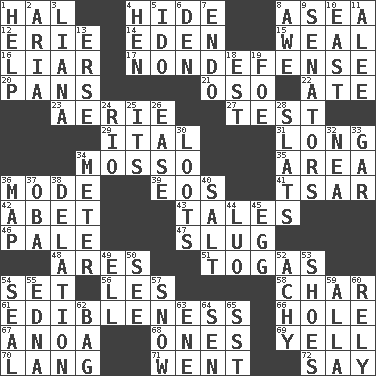 ACROSS 1. Actor Linden 4. Flintstone garb 8. At sea 12. 4th largest of the Great Lakes 14. Paradise 15. Welt 16. One who doesn't tell the truth 17. Unrelated to defense, as in spending 20. Baking dishes 21. Bear (Spanish) 22. Had dinner 23. Nest on high 27. Trial 29. Slanted text style (abbr.) 31. Having great length 34. With motion or animation 35. Type of rug 36. Method 39. Greek goddess of the dawn 41. Russian ruler of old 42. Collude with 43. Stories 46. Light colored 47. Snaillike creature with no shell 48. Ancient Greek god of war 51. Ancient Roman robes 54. Put into a specified state 56. French article 58. Burn to charcoal 61. The property of being fit to eat 66. Opening into or through something 67. Small Philippine buffalo 68. Washington bills 69. Shout 70. Long (Scottish) 71. Left 72. Declare DOWN 1. Assist 2. Roberta Peters solo 3. Woody, climbing, usually tropical plant 4. Layer 5. Wedding promise 6. Lair 7. Inside; within (prefix) 8. Deep reverence 9. Elected representatives 10. 90 degrees 11. Toward shelter 13. Celtic language 18. Eastern Standard Time (abbr.) 19. Enemy 24. _ de Janeiro 25. ___ a Wonderful Life 26. Comfort 28. Narrow boards 30. Plunders 32. Teachers' org. 33. Slender fish 34. Distance measurement 36. Atlas unit 37. Chief or king in Benin or Nigeria 38. Accusation by an informer 40. Table seasoning 44. Nilotic language 45. Oval reproductive body of a fowl 49. Pipe bend 50. Observe 52. Painful 53. Imelda's hoard 54. Lick closed 55. Pulitzer Prize-winning author Ferber 57. Frozen precipitation 59. Silent film actress Nazimova 60. Have trust in 62. Container for groceries 63. Compass dir. 64. Elected rep. 65. Fast jet (abbr.)