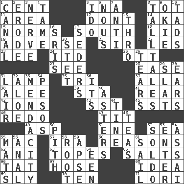ACROSS 1. Penny 5. _ tizzy (2 wds.) 8. Small child 11. Type of rug 12. Do not 14. Alias (abbr.) 15. Typical models 17. Compass direction 18. Hat (slang) 19. Contrary to your interests or welfare 21. Title for a knight 22. French article 23. Area sheltered from the wind 24. It would 25. Baseball player Mel 27. Perceive with the eye 28. Relaxation 31. Desk light 35. Three (prefix) 37. Silent film actress Nazimova 38. Toward shelter 39. R.R. building 41. Stern 42. Charged atoms 43. Fast jet (abbr.) 45. Fast planes 46. Make new 47. Teat (slang) 49. Viper 51. Compass dir. 52. Ocean 55. Big _ 57. Retirement account (abbr.) 60. Thinks logically 62. Black tropical American cuckoo 63. Drinks excessively 65. Table seasonings 66. Make lace 67. Flexible conduit 68. The main thing one is thinking about 69. Insidious 70. "___ Little Indians" 71. Australian parrot (variant) DOWN 1. Lessep's creation 2. Eat (away) 3. Impudent aggressiveness 4. Docile 5. Wedding promise 6. Common sense 7. Opposed to 8. Baron Munchausen's specialties 9. Migrant worker of the '30s 10. Small amounts or degrees 13. Through, poetically 16. Indian titles of respect 17. Spring feasts 20. Proofreading order 26. Pulls into pieces 29. Narrow board 30. Hearing organs 31. Den 32. _ vera 33. Ananias' fault 34. Mexican monetary units 36. It is 40. Michaelmas daisies 44. Prong on a fork 48. Beverages made from leaves 50. Essential or central part 52. Twentieth part of a lira 53. Keyboard key 54. Slender Brazilian palm 55. Floor protectors 56. Of or related to the anus 58. Carrot, for example 59. Domed church section 61. Travel by water 64. Car or cant ending