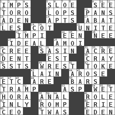 ACROSS 1. Naughty children 5. _ gin 9. Observe 12. "Corrida" creature 13. Chops off 14. Zero-star reviews 15. Arabian gulf 16. Flats, for short 17. Blind as ____ 18. French article 19. Small bed 21. Join together 22. Body of Kaffir warriors 24. Car or cant ending 26. Born 27. Perfect 28. Mine, in Marseilles 29. Algonquian 30. Indian antelope 32. 1/640 square mile 36. Gouge 37. Eastern Standard Time (abbr.) 38. Supercomputer manufacturer 39. Fast planes 40. Take or capture by force 42. Casino tip 43. (Had) reclined 44. Came up 46. And so on (abbr.) 49. "We ___ not amused" (Victoria) 50. Long, evenly shaped pieces 51. _____ steamer (cargo ship) 53. Viper 54. Dripping 57. Israeli folk dance 58. Of or related to the anus 61. Hero or heavy, e.g. 62. In an inward manner 63. Play 64. 4th largest of the Great Lakes 65. Corporate head (abbr.) 66. It was, poetically 67. Paradise DOWN 1. Slanted text style (abbr.) 2. Method 3. Elected leader of a country 4. Boy, to dad 5. Narrow board 6. Chop off 7. Choose 8. Double-curved letter 9. Unit of acoustic absorption 10. Related on the mother's side 11. First name in cosmetics 14. Baking dish 19. Numbers guy (abbr.) 20. Lubricates 21. Single; one (prefix) 23. Confronts 24. Sends forth 25. A really long time 27. Angers 28. NE Netherlands city 29. Music discs 31. Nest on high 32. Thespian 33. What you're doing now 34. Immoral or dissolute person 35. Sight organ 40. Armed conflict 41. Bar bills 43. Pet locale 45. Hit sharply and swiftly 46. Principle of right and wrong 47. Marketplace scale 48. Monte _, Las Vegas Hotel/Casino 52. Fifth month 53. High mountains 55. Writer Wiesel 56. Adolescent 58. Nonscientific branch of learning 59. At this time 60. Housemaid (var.) 61. Portuguese money of account (variant)