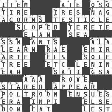 ACROSS 1. A whole individual unit 5. Had dinner 8. Bear (Spanish) 11. Hoop that covers a wheel 12. Angers 13. Tired old horse 14. Oak nuts 17. One of the two male reproductive glands 19. Had an oblique or slanted direction 21. Cylindrical with tapered ends 22. Liveliness 23. Ocean 24. Compass dir. 27. Pismires 29. Insect wing 32. Acquire or gain knowledge or skills 34. Actress Charlotte 36. Independent ruler or chieftain 37. Johnson of "Laugh-In" 38. Raised railways 39. Not divided or shared with others 40. Woody plant 41. And so on (abbr.) 42. Soviet premier 1918-24 43. Ewer handle 44. Suttee (variant) 46. Girls' org. (abbr.) 47. Auto club (abbr.) 50. Be footloose 52. A viewer who gazes fixedly 55. Become visible 57. Characterized by complete cowardliness 59. Takes place subsequently 62. Epoch 63. Body of Kaffir warriors 64. Otherwise 65. Spanish title 66. Ingest 67. For fear that DOWN 1. Call ___ day 2. Nervous spasm 3. Greek god of love 4. Haggard of country music 5. "We ___ not amused" (Victoria) 6. Trials 7. First name in cosmetics 8. At one time in the past 9. Table seasoning 10. Double curve, resembling the letter S 12. It would 15. Pitcher Ryan 16. Connect, as a bridge 18. Retirement account (abbr.) 20. Main course 24. Chalkboard 25. Father Junipero _ 26. Wetness 28. Table seasonings 29. Amid 30. Ms. Damita and namesakes 31. Sports stadium 33. To separate or throw off 35. Fortification 36. Compass dir. 42. Make or become more lively 45. Drink excessively 47. Nonscientific branch of learning 48. Nest on high 49. Scent 51. Artist's stand 52. Moved rapidly 53. "Corrida" creature 54. Actor Alda or Thicke 55. Cuckoo 56. General guideline 58. Choose 60. Curvy letter 61. Arrange properly for use