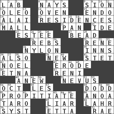 ACROSS 1. Experiment locale 4. Negative votes 8. The Jewish people; Israel 12. Margarine 14. Baking chamber 15. Inside; within (prefix) 16. Jai _ 17. Dwellings 20. Promenade 21. Baking dish 22. Binary compound 23. First name in cosmetics 27. Necklace unit 29. Confederate soldiers (slang) 31. French philosopher Descartes 34. Thermoplastic polyamide 35. Lodging establishments 36. In addition 39. ___ Haven, CT 41. Proofreading order 42. Christmas carol 43. Eat (away) 46. Inactive volcano in Sicily 47. Painter Guido (1575-1642) 48. Afresh 51. Congenital growth or mark on the skin 54. Sep. follower 56. French article 58. Texas town _ City 61. Appease 66. Small Philippine buffalo 67. Pacific island yam 68. One who doesn't tell the truth 69. Cowardly lion portrayer 70. System (abbr.) 71. Singer James 72. Actress Charlotte DOWN 1. Rich soil 2. Silent film actress Nazimova 3. Calif. Air Force Base 4. Not either 5. "___ Maria" 6. Affirmative reply 7. Sever or remove by pinching or nipping 8. Elected rep. 9. Happening 10. Wrote a lyric poem 11. Characteristic smell of wine 13. Lubricates 18. Pat or tap gently 19. Compass dir. 24. Attempt to accomplish something 25. Snakelike fish 26. Inky black, to poets 28. Ascend 30. Scornful expression 32. Compass dir. 33. Eastern Standard Time (abbr.) 34. Pitcher Ryan 36. A saturated hydrocarbon 37. Car dealer's back yard 38. Elected representatives 40. Songbird 44. Single 45. HTML Container Element 49. Connecticut Ivy Leaguer 50. Soggy 52. Freehold land 53. Underwater navigation system 54. Chooses 55. Supercomputer manufacturer 57. Filth; sediment 59. Capital of the state of Qatar 60. Have the gumption 62. Plant holder 63. Small island 64. Make lace 65. Epoch
