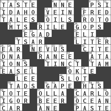 ACROSS 1. Clothes sense 6. Compass dir. 9. Air pressure measure (abbr.) 12. Potato state 13. Distinctive style or manner 14. Flintstone 15. Falsehoods 16. Lubricates 17. Printing process, for short 18. Mountains (abbr.) 19. Cause heat under the collar 20. Republicans 21. Mild oath 23. Connecticut Ivy Leaguer 24. Russian ruler of old 25. 61 cubic inches 28. Hearing organ 30. Mole, birthmark 34. Quote 35. Heredity factor (abbr.) 36. Indian princess (variant) 38. "One Day ___ Time" 39. Charged particles 41. A color or tint 43. Scottish cap 44. Artist's stand 46. Migrant worker of the '30s 48. Area sheltered from the wind 49. Notch 50. Small boys 51. Stare wonderingly 53. Part of HMS, perhaps 56. Carry 57. Spanish pot 58. Monte _, Las Vegas Hotel/Casino 60. Composer Stravinsky 61. Fermented drink made from hops 62. Sea 63. 4-wheeled motor vehicle 64. A saturated hydrocarbon 65. Thick mixture DOWN 1. Teat (slang) 2. First of billions? 3. Table seasoning 4. College papers 5. Greek goddess of the dawn 6. Famous astronaut Armstrong 7. "Death on the ____" 8. Followers of ems 9. Conciliate 10. Puts into a specified state 11. Wedding promise 13. Empty area or space 14. Romp 19. More uncommon 20. Set 22. Separate the seeds from cotton 24. Interpreter 26. Singer James 27. 480, 500 or 516 sheets of paper 28. Singer Brickell 29. Small Philippine buffalo 31. Large container 32. Single; one (prefix) 33. Elected rep. 37. Learning spot: Fr. 40. Sowing specialist 42. Ring climax 45. French article 47. New York city 49. Coast Guard woman 50. Ancient Roman robe 51. Small, secluded valley 52. Toward shelter 54. Angers 55. Narrow board 56. Nervous spasm 57. Chief or king in Benin or Nigeria 58. Police officer (slang) 59. Single