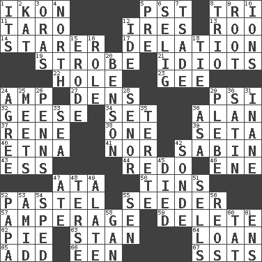 ACROSS 1. Picture 5. Pacific Standard Time (abbr.) 8. Three (prefix) 11. Pacific island yam 12. Angers 13. Friend of Pooh 14. A viewer who gazes fixedly 17. Conveyance 19. Disco prop 21. Foolish or stupid persons 22. Opening into or through something 23. Turn to the right 24. Electrical Unit 27. Hiding places for outlaws 29. 23rd letter of the Greek alphabet 32. Honkers 34. Arrange properly for use 36. Actor Alda or Thicke 37. French philosopher Descartes 38. Single 39. Bristle 40. Inactive volcano in Sicily 41. And not 42. Unit of acoustic absorption 43. Double-curved letter 44. Do over again 46. Compass dir. 47. _ moment's notice (2 wds.) 50. Canisters 52. Soft color 55. Sowing specialist 57. Electrical Measurement 59. Erase 62. Sliced dessert 63. Comedian Laurel of Laurel & Hardy 64. Grant temporary use of 65. Increase 66. Car or cant ending 67. Fast planes DOWN 1. ___ a Wonderful Life 2. Krazy ___ of comics 3. Mouths or openings 4. _ pole 5. Before (prefix) 6. Former Milwaukee Brewers owner Bud 7. Sadhe (variant) 8. Musical group of three 9. Carrot, for example 10. Charged particles 12. Binary compound 15. Eat (away) 16. Hero or heavy, e.g. 18. Standoff 20. Gillaume's butler role 24. Match 25. Confronts 26. Actor Sean's family 28. Sir (Sp.) 29. Cadet 30. Smooth fabric 31. Empty; void 33. Ocean 35. Cigar-shaped 36. White ___ sheet 42. Message 45. Passed on 47. Had dinner 48. Laconic 49. Having winglike extensions 51. Makes a sale 52. Dad 53. Among 54. Drove too fast 55. Elected rep. 56. Vintage cars 58. Separate the seeds from cotton 60. Make lace 61. Followers of ems
