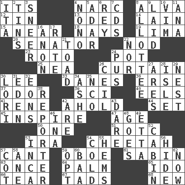 ACROSS 1. ___ a Wonderful Life 4. Drug cop 8. Inventor's middle name 12. Shallow baking pan 13. Wrote a lyric poem 14. (Had) reclined 15. Approach 18. Negative votes 19. Pale green bean 20. Elected representative 22. Lower and raise head in agreement 23. Printing process, for short 24. Cooking vessel 25. Teachers' org. 26. Window treatment 30. Area sheltered from the wind 33. Natives or inhabitants of Denmark 36. Celtic language 37. Scent 39. _-fi 40. Snakelike fish 41. French philosopher Descartes 42. Hold, grip (Informal) 44. Put into a specified state 45. Stimulate to action 47. Personal question 50. Single 51. College mil. group 53. Retirement account (abbr.) 54. Leopard's kin 57. Patter 59. Mitch Miller's instrument 61. Unit of acoustic absorption 63. At one time in the past 64. Inside of hand 65. Wedding promise 66. Pull apart 67. Small boys 68. ___ Haven, CT DOWN 1. Call ___ day 2. Canisters 3. Scornful expression 4. Words to Nanette 5. The sixth month of the Jewish calendar 6. Marina Del _, California 7. Music discs 8. One to whom something is allotted 9. Put down 10. Zeal 11. Santa ___, CA 16. At once, immediately (arch.) 17. Pace 21. Frog relative 22. And not 24. Product of festering 26. To provide with a ceiling 27. Ancient Greek god of war 28. Small island 29. A home for chicks 30. Australian parrot (variant) 31. Locale of original sin 32. Immeasurably long periods of time 34. American tennis player Robert 35. Non-commissioned officer (abbr.) 38. Newsperson 42. "We ___ not amused" (Victoria) 43. Have the gumption 46. _ tizzy (2 wds.) 48. Moves 49. Singer James 52. Apartment or room in a ship 53. South American Indian 54. Chilled 55. Equivocates 56. Flintstone garb 57. Small bed 58. One (Scot) 59. Choose 60. Sound made by sheep 62. At this time