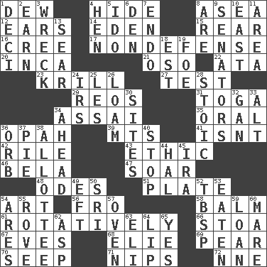 ACROSS 1. Morning condensation 4. Flintstone garb 8. Toward the sea 12. Hearing organs 14. Paradise 15. Stern 16. Algonquian 17. Unrelated to defense, as in spending 20. South American Indian 21. Bear (Spanish) 22. _ moment's notice (2 wds.) 23. The principal food of baleen whales 27. Trial 29. Vintage cars 31. Ancient Roman robe 34. Slender Brazilian palm 35. Of the mouth 36. Brightly colored fish 39. Mountains (abbr.) 41. Is not 42. Cause heat under the collar 43. Value system 46. Actor Lugosi 47. Fly high 48. Lyric poems 51. Food holder 54. Nonscientific branch of learning 56. Away 58. Lip ointment 61. Happening in regular succession 66. Portico 67. Nights before holidays 68. Writer Wiesel 69. Lightbulb-shaped fruit 70. Ooze 71. Cuts off 72. Compass dir. DOWN 1. Tenth: prefix 2. Merit 3. Raze 4. Layer 5. Wedding promise 6. Lair 7. Inside; within (prefix) 8. "We ___ not amused" (Victoria) 9. Elected representatives 10. 90 degrees 11. Type of rug 13. Dry up 18. Eastern Standard Time (abbr.) 19. Enemy 24. Big collection agency 25. French article 26. Rich soil 28. Unemotional 30. Settings 32. Separate the seeds from cotton 33. Keyboard modifier key 34. Forward in time 36. Globe 37. Sliced dessert 38. One to whom something is allotted 40. Discontinue 44. Actor Linden 45. Retirement account (abbr.) 49. Bank Draft (abbr.) 50. _ Lanka 52. Cook's measure (abbr.) 53. Consumed 54. Ancient Greek god of war 55. Be footloose 57. Baking chamber 59. Grant temporary use of 60. Female horse 62. Cleo's killer 63. Connecticut Ivy Leaguer 64. Mouth edge 65. Affirmative reply