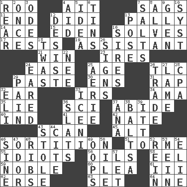 ACROSS 1. Friend of Pooh 4. Small island 7. Sinks 11. Conclusion 12. "You Light Up My Life" star Conn 13. Chummy 14. Adept person 15. Locale of original sin 16. Finds the solution 17. Musical pauses 19. Aide 21. Acquire through effort 23. Angers 24. Relaxation 25. Grow older 26. Affectionate concern, for short 29. Thick mixture 30. Followers of ems 31. Hit sharply and swiftly 32. Hearing organ 33. Big collection agency 34. Nanny (var.) 35. Untruth 36. _-fi 37. Stay 40. Indiana (abbr.) 41. Area sheltered from the wind 42. Nathan's nickname 43. Glance over 45. The first octave above the treble staff 46. Determination 51. Singer Mel 55. Foolish or stupid persons 56. Lubricates 58. Snakelike fish 59. Impressive in appearance 60. Entreaty 61. One more than two 62. Celtic language 63. Put into a specified state 64. Compass dir. DOWN 1. Tail end 2. Single time 3. Lyric poems 4. Help 5. It may be bright or harebrained 6. Canisters 7. Table seasonings 8. Inventor's middle name 9. Small, secluded valley 10. System (abbr.) 12. Cease 13. Airs 16. Male parents of animals 18. It was, poetically 20. Signals 22. Born 24. Having ears or earlike features 25. Nest on high 26. Swap 27. Unable to walk 28. Tax preparer (abbr.) 29. Ache 32. Biblical high priest 33. Ancient Celtic tribe of eastern Britain 36. Narrow boards 37. Santa ___, CA 38. Greek mezzo-soprano Agnes 39. "Tell ____ the Marines!" 43. Fur scarf 44. Quote 46. Trig term 47. Scent 48. Teases 49. I made a mistake 50. "Death on the ____" 52. It's straight from the horse's mouth 53. Count _ (2 wds.) 54. Writer Wiesel 57. Allow