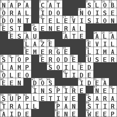 ACROSS 1. California wine valley 5. Domesticated feline 8. Oscar Madison type 12. Of the mouth 13. Wedding promise 14. Annoying sound 15. Do not 16. Household entertainment appliance 19. Eastern Standard Time (abbr.) 20. Commissioned military rank 21. He sold his birthright 23. Had dinner 24. Insect wing 27. Goldbrick 30. Tending to cause great harm 31. Develop 34. Pale green bean 35. Close up, plug up 38. Eat (away) 40. One who uses or employs something 41. Desk light 42. Dirtied 44. Butter sub 45. Event that recurs at intervals 46. Car or cant ending 47. Two (Sp.) 50. The content of cognition 53. Heighten or intensify 57. Fish or hair follower 59. Supplying deficiencies 63. "Two Mules for Sister ____" 64. Go after with the intent to catch 65. Baking dish 66. Commotion 67. Assistant 68. Compass dir. 69. Shed a tear DOWN 1. Thickened enlargement 2. Came up 3. Leg coverings 4. Keyboard modifier key 5. Quote 6. An important port of Yemen 7. Lacquered or enameled metalware 8. Distress signal 9. Cards in a Roman deck? 10. Bear (Spanish) 11. Benjamin's nick name 14. The longest river in the world 17. Period 18. Large container 20. Island territory of the United States 22. City in Syria 24. Advice 25. Citrus frut 26. Having or resembling wings 28. Last letter of the English alphabet 29. Blunders 30. Evaded 32. Thick or sticky substance 33. Prepare for publication 35. _ gin 36. Falsehood 37. Sign of things to come 39. Biblical high priest 43. Singer Brickell 47. Deli pickle 48. Single 49. Fast jet (abbr.) 51. Maternal 52. Nest on high 54. Corncob 55. "Terrible" tsar 56. French philosopher Descartes 58. Canvas cover 59. R.R. building 60. RI univ. 61. Groovy apt. 62. Sliced dessert 63. Compass dir.