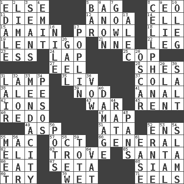 ACROSS 1. Otherwise 5. Paper or plastic container 8. Corporate head (abbr.) 11. South Vietnam president (1954) 12. Small Philippine buffalo 14. Pipe bend 15. With great haste 17. Move like a hungry wolf 18. Whopper 19. Small, flat, pigmented spot on the skin 21. Compass dir. 22. Part of a journey 23. Double-curved letter 24. Infant locale 25. Police officer (slang) 27. Snakelike fish 28. "______ My Girl" (Turtles hit) 31. Desk light 35. 54 in ancient Rome 37. Root beer relative 38. Toward shelter 39. Allow head to fall sleepily 41. Of or related to the anus 42. Charged particles 43. Armed conflict 45. Monthly bill 46. Make new 47. Atlas unit 49. Cleo's killer 51. "One Day ___ Time" 52. Followers of ems 55. Apple computer (short form) 57. Sep. follower 60. Commissioned military rank 62. Connecticut Ivy Leaguer 63. Collection of objects 65. Before Barbara or Clara 66. Ingest 67. Bristle 68. Thailand, formerly 69. Attempt 70. Soggy 71. Snakelike fish DOWN 1. Peak District village in England 2. Citrus fruits 3. Actors Connery and Penn 4. Give off 5. Drinking establishment 6. Soon (poet.) 7. Long dress 8. Portable communications device 9. Writer Wiesel 10. Cassini of fashion 13. Actor Baldwin 16. "Death on the ____" 17. Cotton for raincoats, e.g. 20. Highlander 26. Motion picture award 29. Liveliness 30. Table seasoning 31. Den 32. _ vera 33. Ananias' fault 34. Mexican monetary units 36. Promise 40. Break 44. Assign a rank or rating to 48. Zero-star reviews 50. Plant holders 52. Bert's buddy 53. Brizilian seaport 54. Criticizes harshly 55. Confront 56. Having or resembling wings 58. Group working together 59. Carryall 61. Relaxation 64. Large container